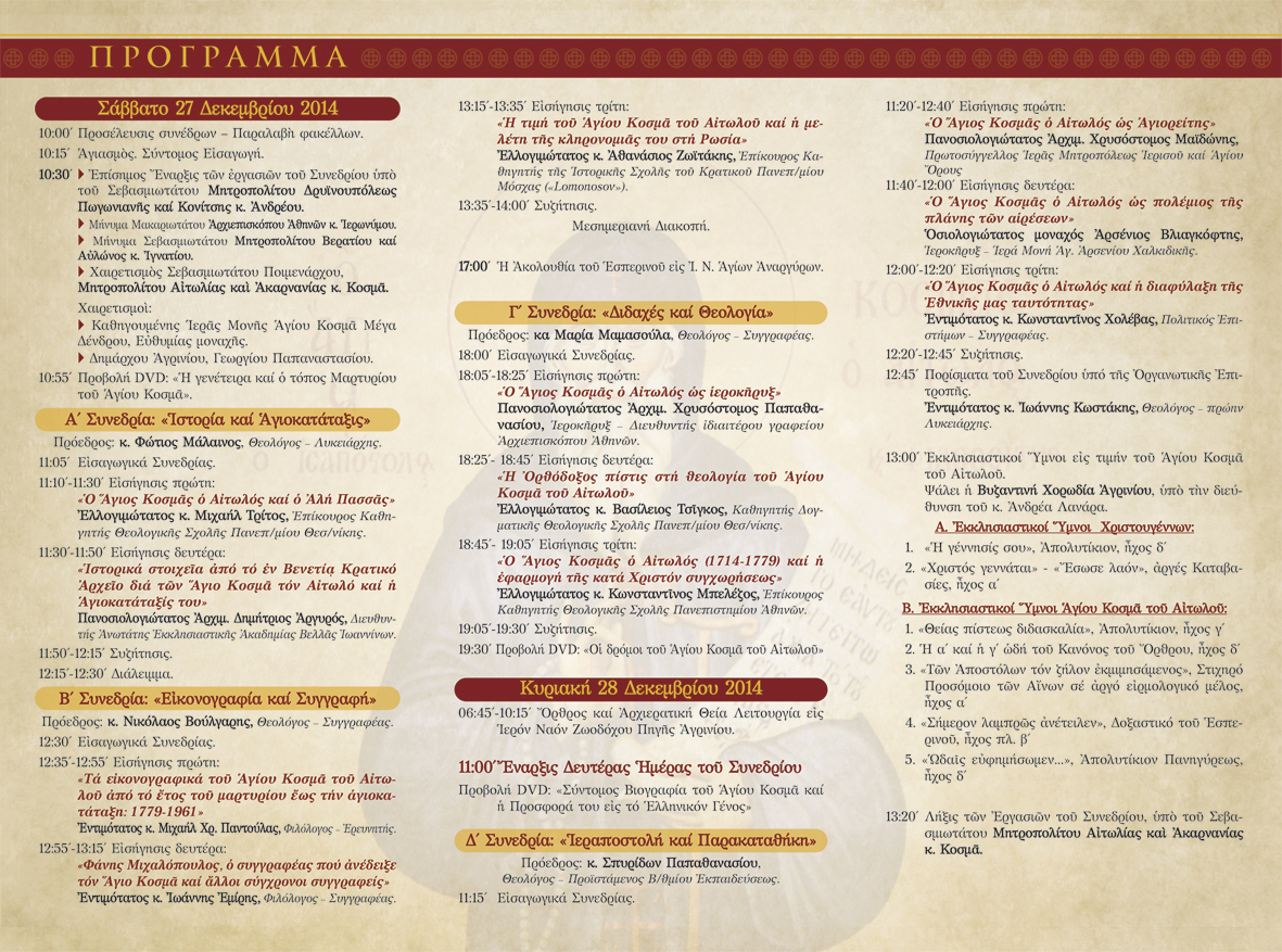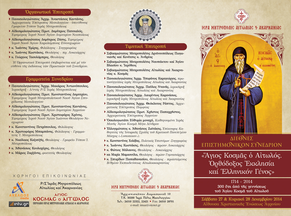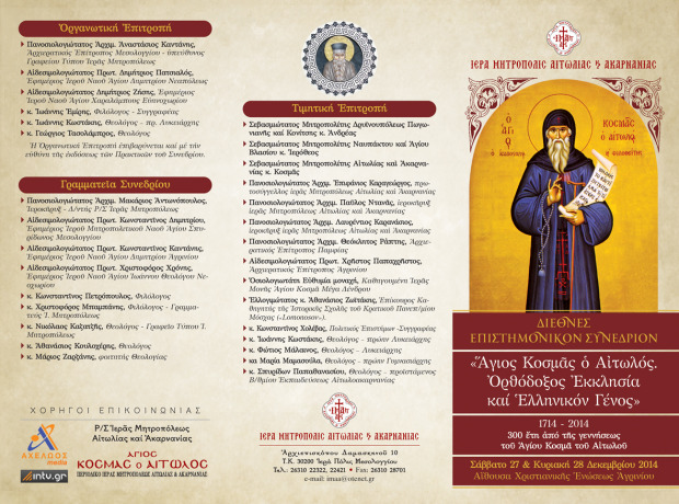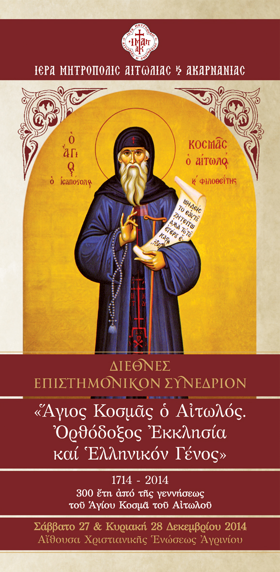 Η Ιερά Μητρόπολη Αιτωλίας και Ακαρνανίας διοργανώνει Διεθνές Επιστημονικό Συνέδριο προς τιμήν του μεγάλου Προστάτου και Πολιούχου της Ιεράς Μητροπόλεώς μας, Αγίου Κοσμά του Αιτωλού το Σάββατο 27 και την Κυριακή 28 Δεκεμβρίου 2014 στην πόλη του Αγρινίου.