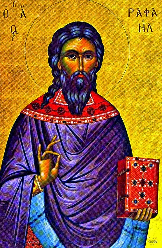 Πάνω, όμως, από την ιατρική διάγνωση και πέρα από την φαρμακευτική θεραπεία, στέκεται ψηλότερα η θρησκεία μας με όλους τους Αγίους της. Έτσι, λοιπόν, μέσα στη στενοχώρια μου και τη θλίψη μου, εκεί που νόμισα πως η ζωή μου μαύρισε και πως η χαρά από την οικογένειά μου χάθηκε για πάντα, άνοιξε η πόρτα του θαλάμου και μπήκε μέσα μια ηλικιωμένη γυναίκα που πουλούσε εικονίσματα Αγίων, για να ζήσει. Μέσα από τη μεγάλη τσάντα με τα εικονίσματα, επέλεξε τυχαία και μου πρότεινε ένα εικόνισμα. Ήταν αυτό του Αγίου Ραφαήλ. «Πάρε, παιδάκι μου, αυτή την εικονίτσα» μου είπε, «κι’ ο Άγιος Ραφαήλ θα κάνει καλά το παιδάκι σου».