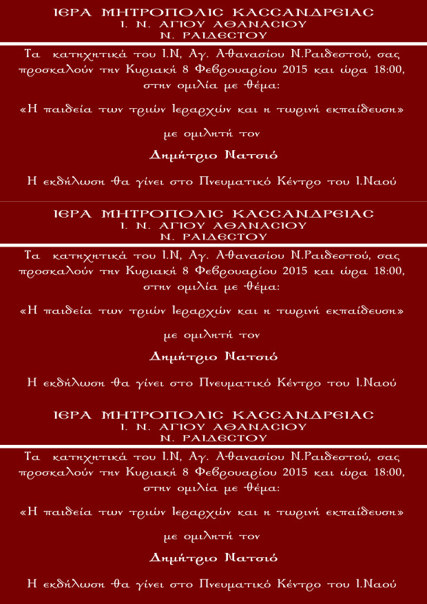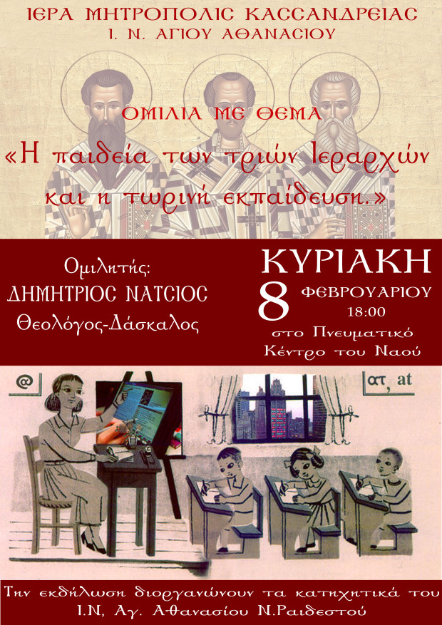 Ομιλία με θέμα: «Η παιδεία των τριών Ιεραρχών και η τωρινή εκπαίδευση» από τον Ι.Ν. Αγίου Αθανασίου Ραιδεστού 28 Ιανουαρίου 2015 Tags:Ομιλία με θέμα :"Η παιδεία των τριών Ιεραρχών και η τωρινή εκπαίδευση"από τον Ι.Ν.Αγίου Αθανασίου Ραιδεστού