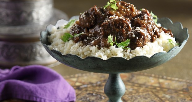 - Αλατοπιπερώνουμε αν χρειαστεί. Βάζουμε το κρέας πάνω από κους κους. Πασπαλίζουμε με σουσάμι και σερβίρουμε.