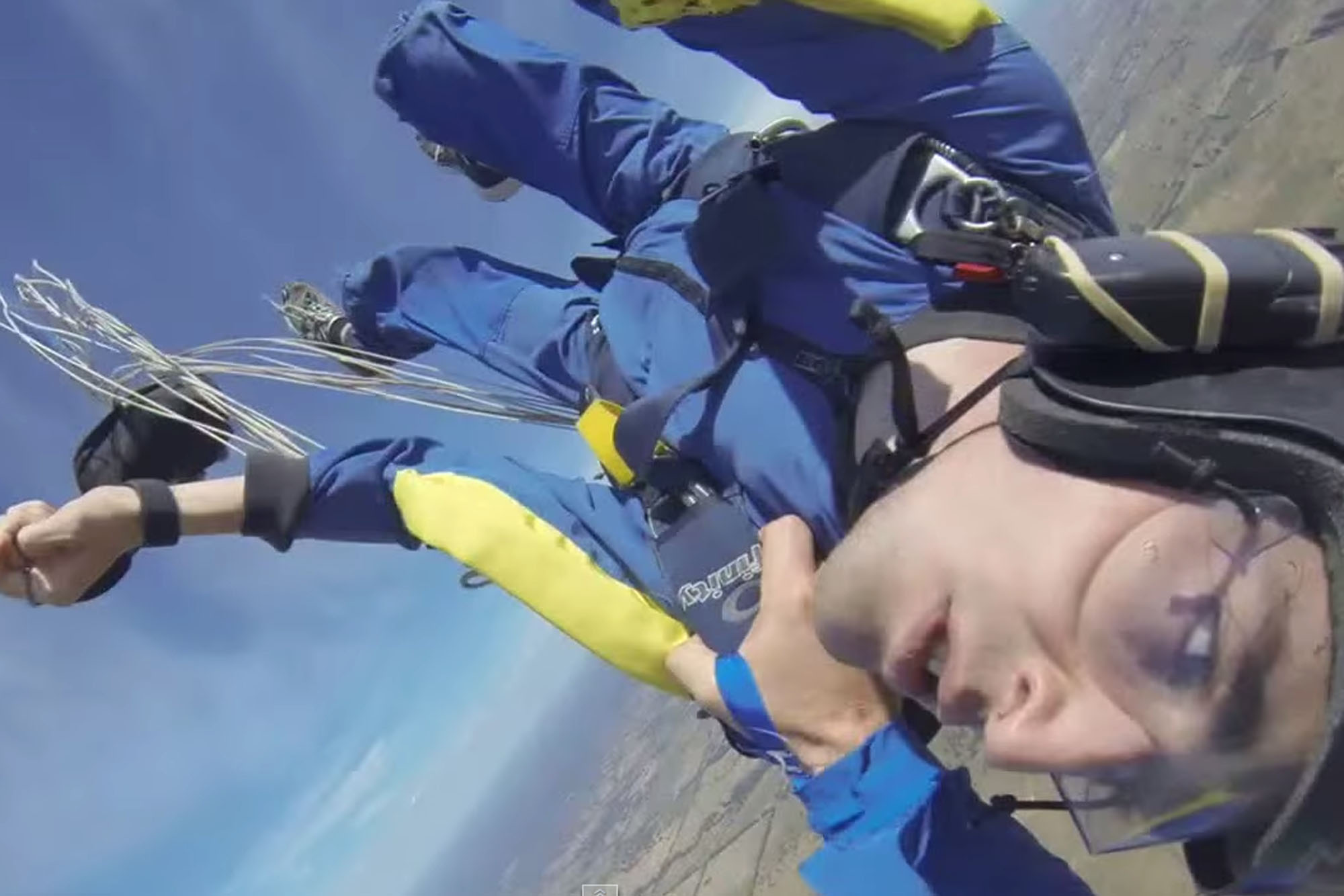 Προσπαθεί για δεύτερη φορά και καταφέρνει να του ανοίξει το αλεξίπτωτο, αφήνοντας τον να συνεχίζει την πτώση ενώ είναι δεν έχει τις αισθήσεις του, και απομακρύνονται. Το βίντεο κόβεται εκεί.