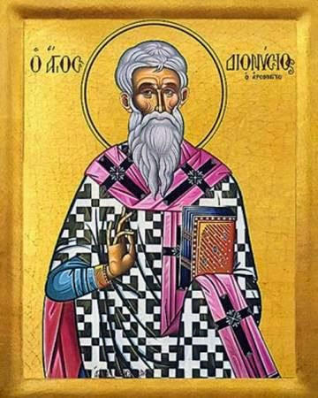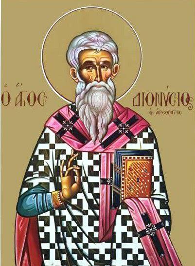 São Dionísio é mencionado no livro dos Atos dos Apóstolos juntamente com sua esposa Damarás. Converteu-se ao cristianismo através das pregações do Apóstolo São Paulo, quando este visitou Atenas na Grécia. Conhecedor da filosofia grega, Dionísio era um dos conselheiros da suprema corte de justiça, conhecida também por Comité Aerópago. Diz-se que no dia da crucificação do Senhor em Jerusalém, Dionísio viu um eclipse solar, fenómeno desconhecido da astronomia daquela época. Tal fato fez com que Dionísio dissesse: «Ou Deus está ofendido, ou o fim do mundo está próximo»! Quando São Paulo passou por este centro cultural de Atenas que era o Aerópago, proclamou a célebre homilia: «Atenienses, em tudo vos vejo um tanto supersticiosos; porque, passando eu e vendo os vossos santuários, achei também um altar em que estava escrito: Ao Deus Desconhecido. Esse, pois, que vós honrais, não o conhecendo, é o que eu vos anuncio» (At. 17, 22); e começou a pregar o Deus verdadeiro. Por mais que, por causa disso, muitos tivessem zombado de Paulo, outros aderiram à fé e creram; e entre esses estava Dionísio. A tradição nos diz que Dionísio foi o primeiro Bispo de Atenas. Viveu 90 anos e foi decapitado durante a perseguição aos cristãos na época do imperador Domiciano (96 dC). Seu crânio está conservado no Monastério búlgaro Docheiariou, no Monte Athos. Desde o século V, divulgaram-se uns escritos místicos intitulados «Dionísio, o Aeropagita», que tiveram certa importância para a Igreja. Hoje, porém, os estudiosos afirmam que estes escritos podem não ter sido de sua autoria, mas que, o mais provável é que tenham sido compilados por um desconhecido das terras sírias, nas últimas décadas do século V. Por tal razão, tais escritos são conhecidos hoje como «Escritos apócrifos de Dionísio, o aeropagita».