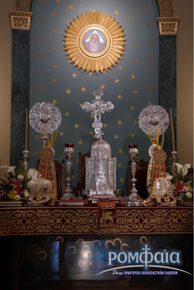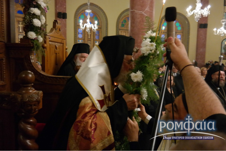 Στον εσπερινό χοροστάτησε ο Πανιερώτατος Μητροπολίτης Κιτίου κ. Χρυσόστομος, παρουσία του Πατριάρχη Αλεξανδρείας κ. Θεοδώρου Β, του Αρχιεπισκόπου Αθηνών και πάσης Ελλάδος κ. Ιερωνύμου και πλήθους Αρχιερέων.