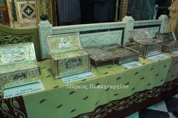 Στον Ναό εκτίθενται προς ευλογία των πιστών Τεμάχιο του Τιμίου Ξύλου και των Ιερών Λειψάνων του Αγίου Ιωάννου του Χρυσοστόμου, του Οσίου Σεραφείμ του Σάρωφ του ιαματικού, του Αγίου Λουκά Αρχιεπισκόπου Συμφερουπόλεως του ιατρού, του Αγίου Αυγουστίνου και της Αγίας μητρός Αυτού Μόνικας, από την Ιερά Μονή Τρικόρφου Δωρίδος.