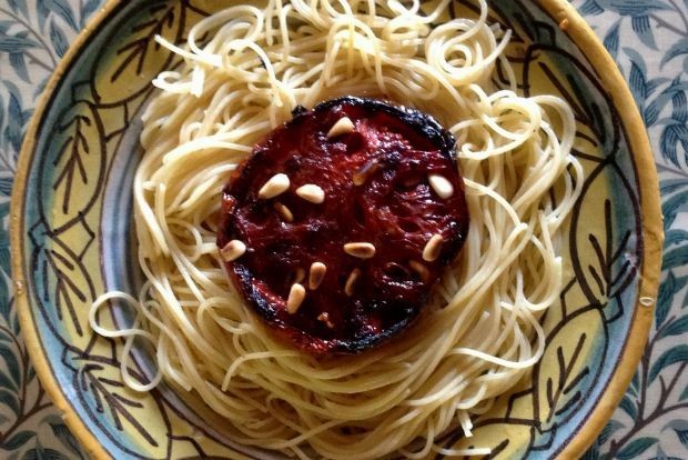 Με βάση το σημείωμα της Αγλαΐας Κρεμέζη για ντομάτες κονφί, η Καλή Δοξιάδη υψώνει τις ψητές ντομάτες σε βάθρο κύριου πιάτου. Αλάτι, κανέλα, ελαιόλαδο, κουκουνάρι και ζάχαρη και ροδόνερο – μη σας ξενίζουν τα τελευταία και η γλυκερή τους γεύση, από το ροδόνερο θα μείνει μόνο μια αρωματική ιδέα και η ζάχαρη απλώς θα εντείνει τη συγκεντρωμένη νοστιμιά της ντομάτας. Το αποτέλεσμα; Καραμελωμένες ντομάτες που λιώνουν εύκολα με το πηρούνι, ιδεώδες ταίριασμα τα μόλις βρασμένα ζυμαρικά. Το τυρί προαιρετικό. Μα και χωρίς κατσαρόλα, ένα κριθαράκι βρασμένο στον φούρνο, στο ζουμί της ντομάτας, κάνει φίνο χορτοφαγικό γιουβέτσι.