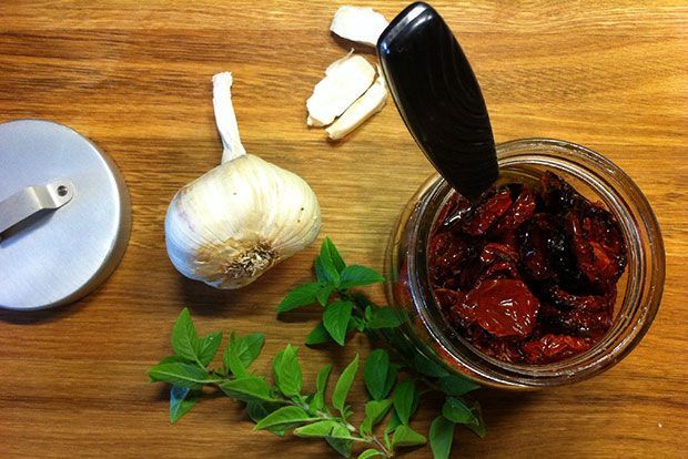 Πρώτη σε τέτοιες νοστιμιές η Λεονί Σταφυλά, που μπορεί συνήθως να ετοιμάζει ψευτο-λιαστές ντομάτες προς τα μέσα του Σεπτέμβρη, λίγο πριν εξαφανιστούν οι αληθινές, όμως εγώ κλέβω την ιδέα της νωρίτερα επειδή οι λιαστές ντομάτες είναι πάντα ωραίες και γιατί όσες βρίσκω τώρα στα μανάβικα δεν έχουν νοστιμέψει για τα καλά. Πομοντόρια, λάδι, σκόρδο, φρέσκα μυρωδικά, αλατοπίπερο και λίγη ζάχαρη. Ψήνει ντομάτες και σκόρδο στον φούρνο και από εκεί στα βάζα καλυμμένα με ελαιόλαδο. Απλωμένα σε καψαλισμένα ψωμάκια με λίγο κατσικίσιο τυρί – μούρλια! Διπλό το κέρδος: το λάδι από τα βάζα μπαίνει ωμό σε σαλάτες και μαγειρευτά και τα τονώνει σε γεύση.
