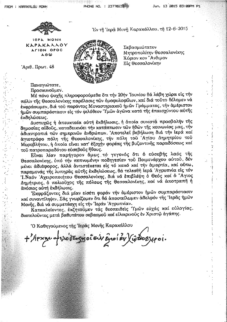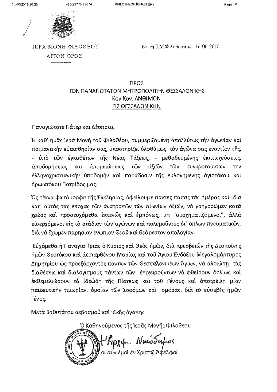 Επιστολές συμπαράστασης, στο Μητροπολίτη Θεσσαλονίκης, από 2 Αγιορείτικες Μονές