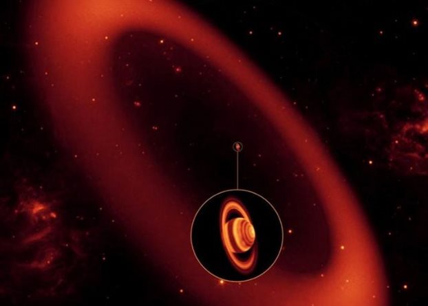 Αόρατος στο φάσμα του ορατού φωτός, ο μεγαλύτερος δακτύλιος του Κρόνου ανακαλύφθηκε μόλις το 2009. Νέες, πιο ευαίσθητες παρατηρήσεις αποκαλύπτουν τώρα ότι είναι ακόμα μεγαλύτερος από ό,τι είχε εκτιμηθεί: αν ο Κρόνος είχε μέγεθος μπάλας ποδοσφαίρου, το δαχτυλίδι θα ήταν όσο τα δύο τρίτα του γηπέδου.