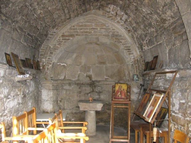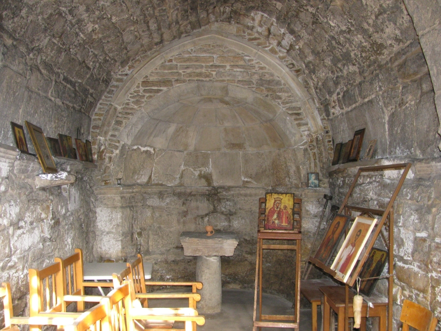 Ο ναός εσωτερικά είναι πολύ όμορφος και ξεχωριστός. Έχει ένα αξιόλογο αρχιτεκτονικό σχήμα το οποίο εντυπωσιάζει με την μεγαλοπρέπειά του αλλά και με τα χαρακτηριστικά του γνωρίσματα. Τόσο το ημικυκλικό σχήμα της οροφής, το οποίο δεν διακρίνεται εξωτερικά, όσο και η κεντρική αψίδα του ναού, δίνουν την εντύπωση μιας μεγάλης κατακόμβης. Στην ανατολική εσωτερική πλευρά διακρίνεται η μοναδική κόγχη του Ιερού η οποία φαίνεται να δέχτηκε νεώτερες επεμβάσεις (ανακατασκευές) λόγω κατάρρευσής της στο παρελθόν. Τόσο οι πέτρες όσο και το μάρμαρο που χρησιμοποιήθηκε στην αψίδα της κόγχης δείχνουν τις νεότερες επεμβάσεις οι οποίες πραγματοποιήθηκαν τα τελευταία χρόνια με ένα σωστό και επιστημονικό τρόπο από το Τμήμα Αρχαιοτήτων. Φυσικά ο ναός χρειάζεται αρκετές ακόμη συντηρήσεις τόσο στο εσωτερικό του όσο και στον περίβολο χώρο του αλλά αυτό δεν τον εμποδίζει από το να καταστεί ένας από τους σημαντικούς θρησκευτικούς προορισμούς της Κύπρου.