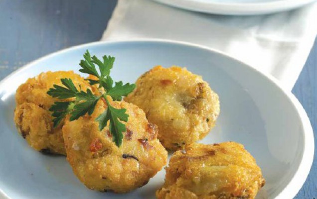 Κομματιάζετε το βρασμένο ψάρι και το αναμειγνύετε με τα κρεμμύδια (τα φρέσκα και το ξερό), τις λιωμένες πατάτες, το σκόρδο, τα αυγά, τρεις κουταλιές της σούπας ελαιόλαδο, το μαϊντανό, τη ρίγανη, το ούζο (ή το τσίπουρο), το αλάτι και φρεσκοαλεσμένο μαύρο πιπέρι.