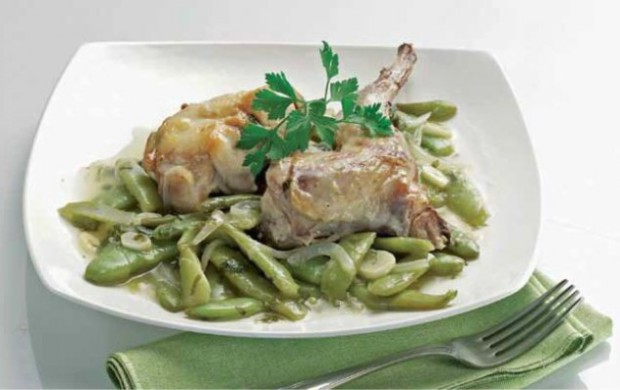 Ζεµατίζετε τα φασολάκια για 5΄, τα στραγγίζετε και τα βάζετε στην κατσαρόλα πάνω από το κουνέλι. Ανακατεύετε προσεκτικά το φαγητό, προσθέτετε 1 φλιτζάνι νερό και το αφήνετε να βράσει για 35΄. Kουνάτε
