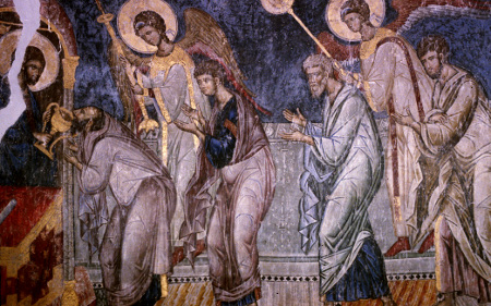 Είδε μια ωραιοτάτη γυναίκα εν μέσω δύο Αγγέλων, η οποία φωτοβολούσε περισσότερο από τον ήλιο. Ο μεν ένας Άγγελος κρατούσε ένα ποτήριο γεμάτο Άρτο ουράνιο, και ο έτερος ένα λεπτό μανδύλιο. Η δε ωραία εκείνη γυνή, η οποία ήταν η Δέσποινά μας, εβάσταζε μια χρυσή λαβίδα, και ερχόταν προς αυτήν ένας-ένας οι μοναχοί, καθάριζε το πρόσωπό τους ο Άγγελος με το μανδύλιο, έπειτα προσκυνούσε την Παναγία και αυτή λάμβανε τη λαβίδα και του μετέδιδε τον ουράνιο Άρτο.