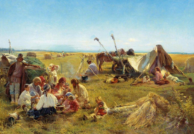 Ρώσοι καλλιτέχνες περνούσαν τον καιρό τους ζωγραφίζοντας την καλοκαιρινή ζωή: την ομορφιά της ανθισμένης φύσης, τη συγκομιδή των αγροτών, τον ηλιόλουστο καιρό, τις βόλτες στο δάσος, τα ήσυχα χωριά τα βράδια, τις γυναίκες να φτιάχνουν μαρμελάδα με μούρα, το κολύμπι στο ποτάμι. / Δείπνο αγροτών στη διάρκεια της συγκομιδής, 1871, Κονσταντίν Μακόφσκι.