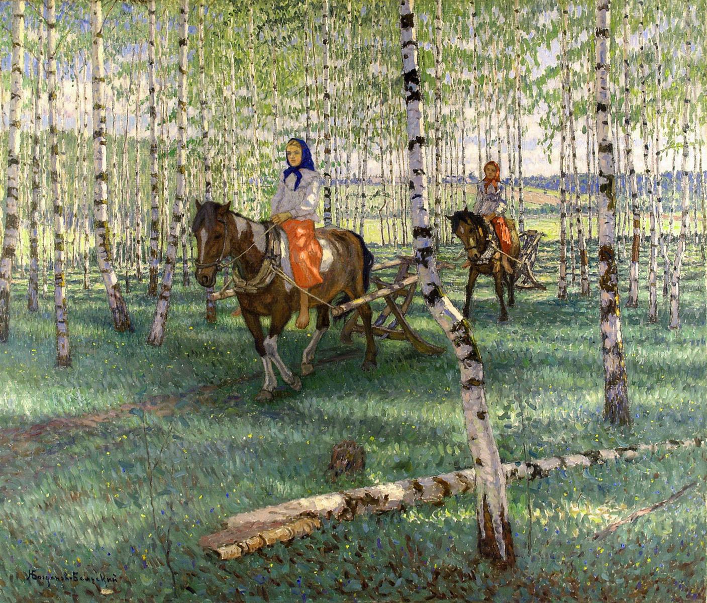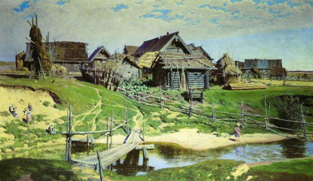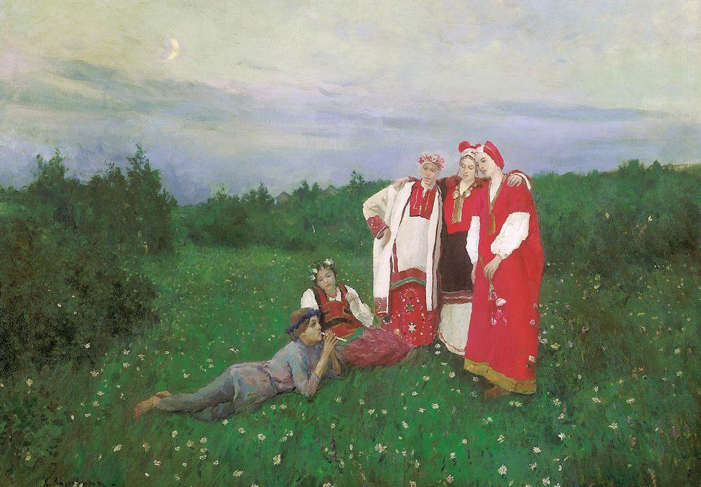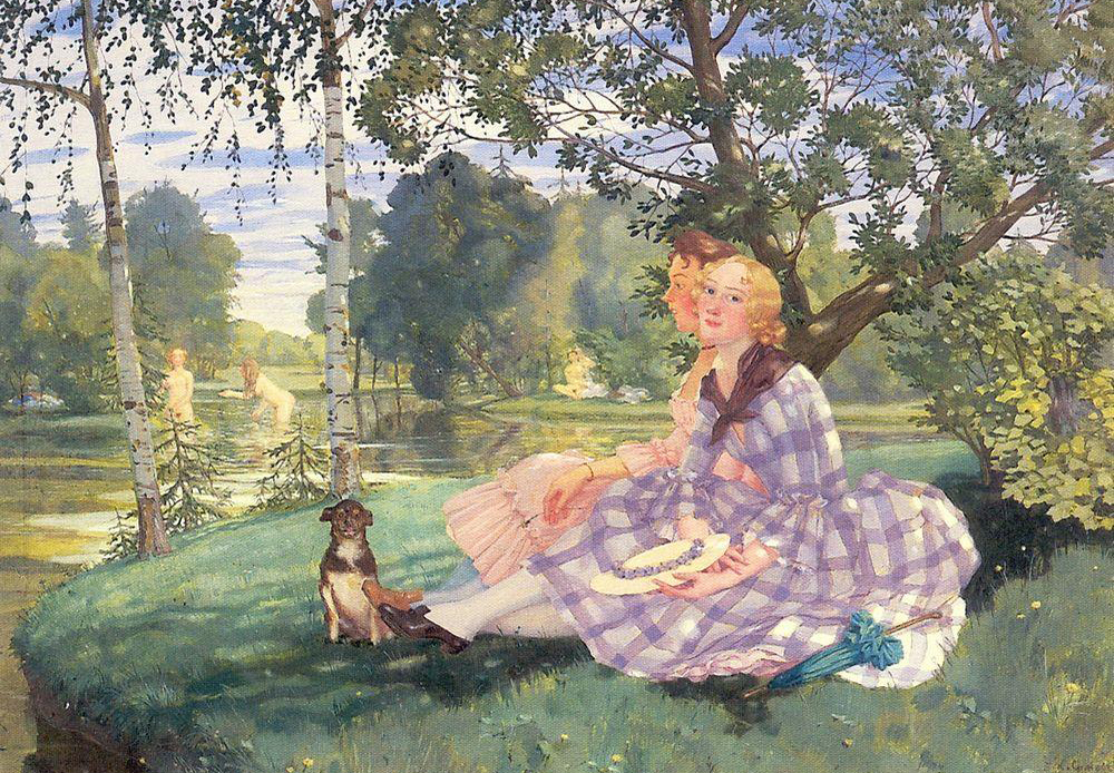 Ρώσοι καλλιτέχνες περνούσαν τον καιρό τους ζωγραφίζοντας την καλοκαιρινή ζωή: την ομορφιά της ανθισμένης φύσης, τη συγκομιδή των αγροτών, τον ηλιόλουστο καιρό, τις βόλτες στο δάσος, τα ήσυχα χωριά τα βράδια, τις γυναίκες να φτιάχνουν μαρμελάδα με μούρα, το κολύμπι στο ποτάμι. / Δείπνο αγροτών στη διάρκεια της συγκομιδής, 1871, Κονσταντίν Μακόφσκι.