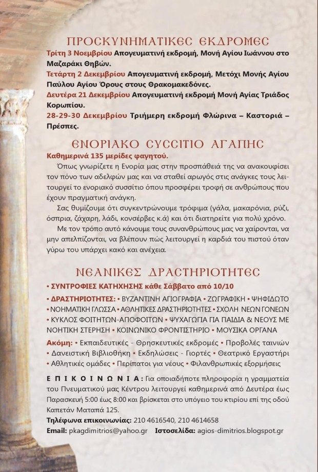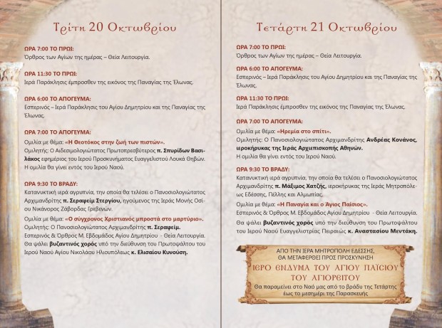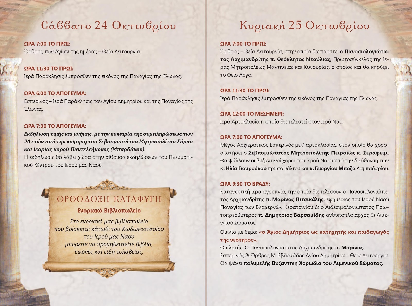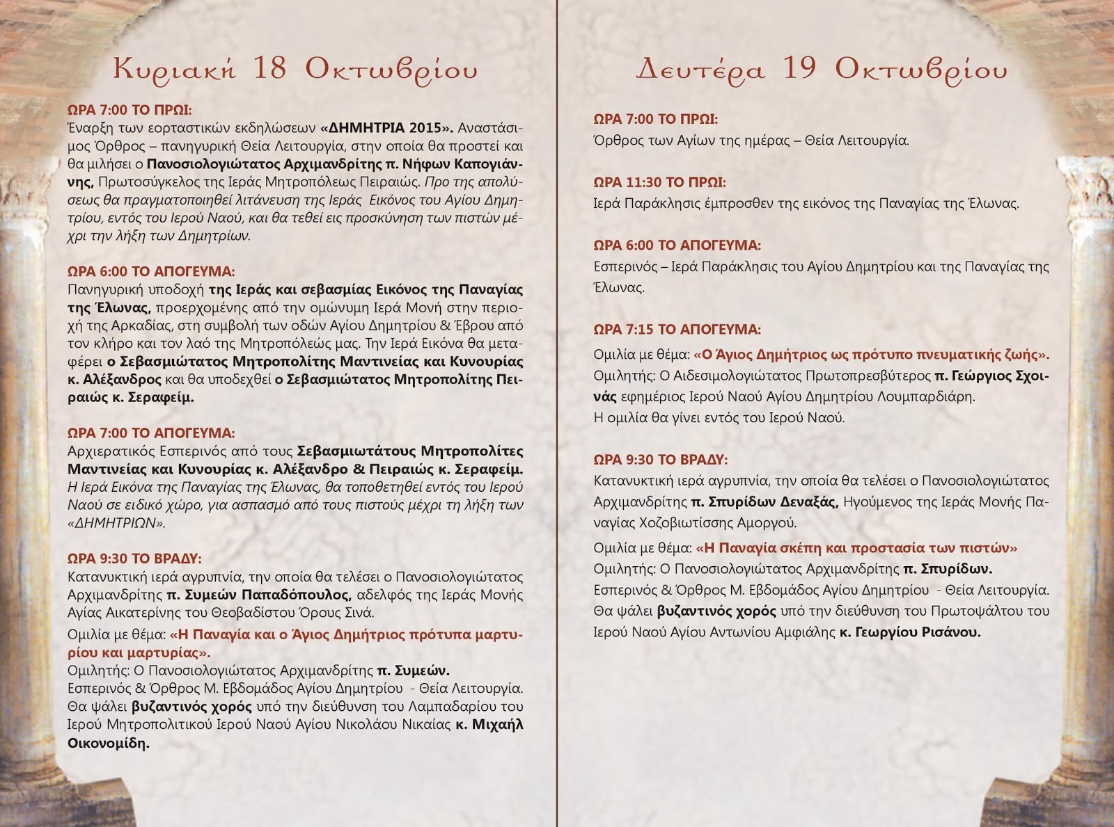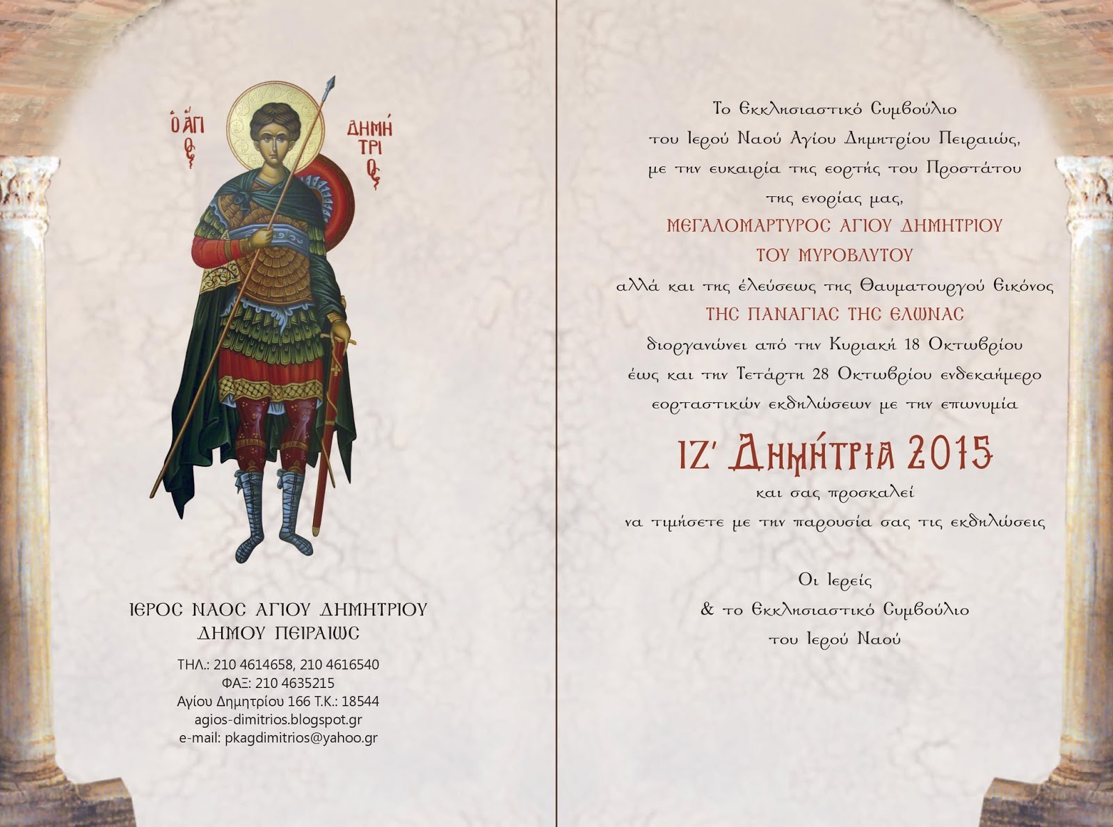 Γιά το αναλυτικό πρόγραμμα των εκδηλώσεων μπορείται να επισκευθείτε την ιστοσελίδα του Ιερού Ναού Αγίου Δημητρίου Πειραιώς ( www. agios-dimitrios.blogspot.com )