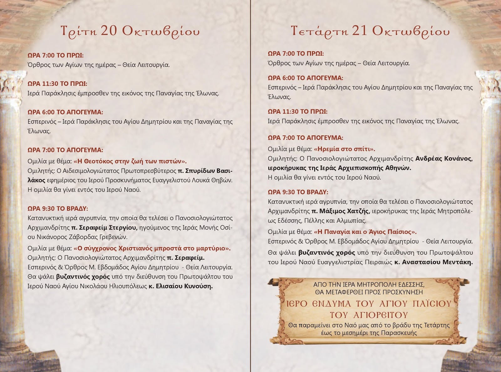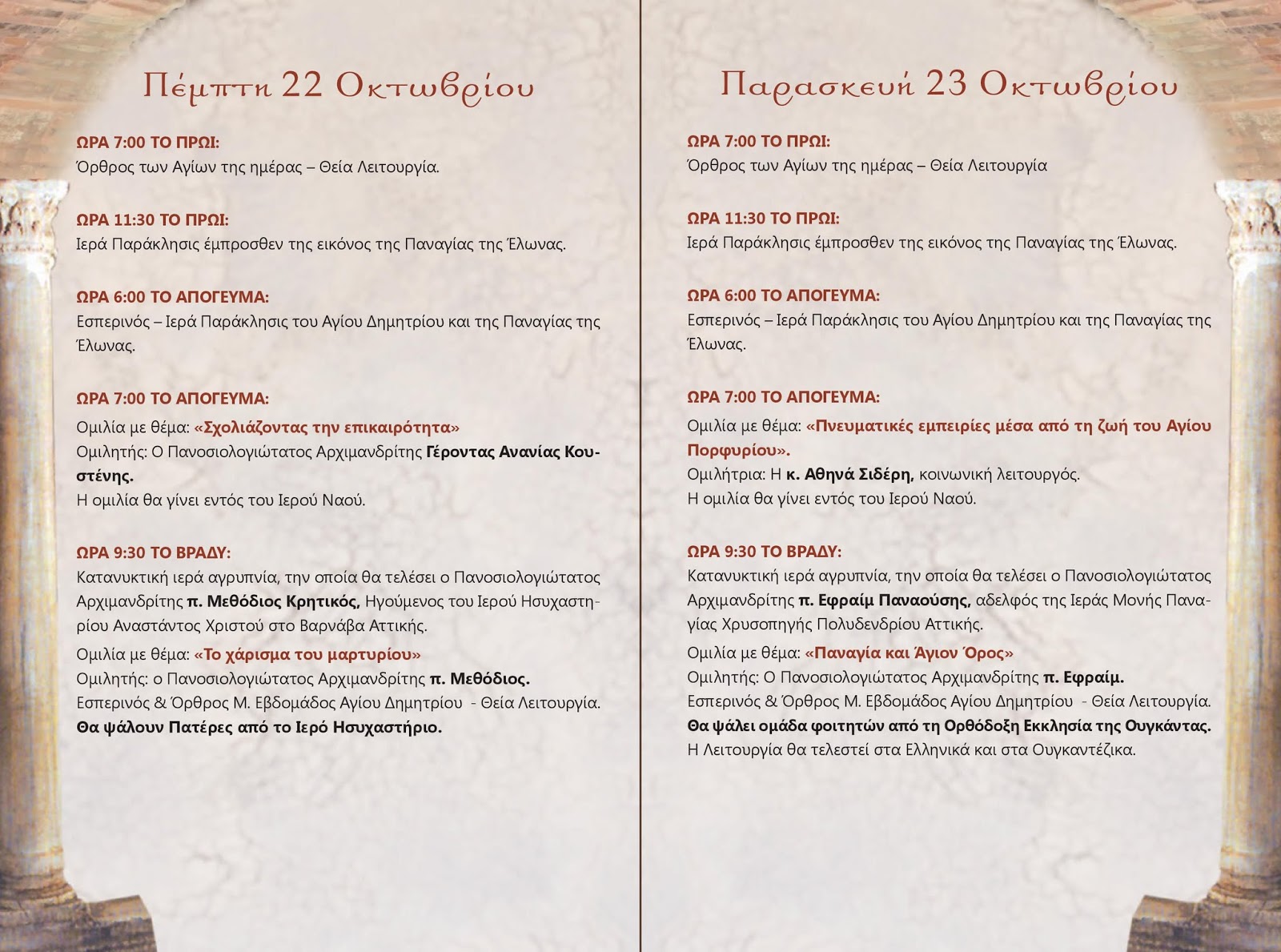 7:00-8:00 Ομιλία εντός του Ιερού Ναού από τους: π. Συμέων Παπαδόπουλο αδελφό της Ιεράς Μονής Σινά, π. Γεώργιο Σχοινά (Άγιο Δημήτριο Λουμπαρδιάρη), Γέροντα Σπυρίδωνα Δεναξά, Ηγούμενο της Ιεράς Μονής Χοζοβιωτίσσης Αμοργού, π. Σπυρίδωνα Βασιλάκο, (από Ι.Μητρόπολη Θηβών και Λεβαδείας), π. Σεραφείμ Στεργίου, Ηγούμενο της Ιεράς Μονής Οσίου Νικάνορος Γρεβενών, π. Ανδρέα Κονάνο (Ι. Αρχιεπισκοπή Αθηνών), π. Μάξιμο Χατζή (Ι. Μητρόπολη Εδέσσης), Γέροντας Ανανίας Κουστένης, π. Μεθόδιος Κρητικός, Ηγούμενος του Ιερού Ησυχαστηρίου Αναστάντος Χριστού, Βαρνάβα Αττικής, π. Εφραίμ Παναούσης (Ι. ΜΟνή Παναγίας Χρυσοπηγής), Σεβασμιώτατο Μητροπολίτη Νέας Ιωνίας και Φιλαδελφείας κ. Γαβριήλ