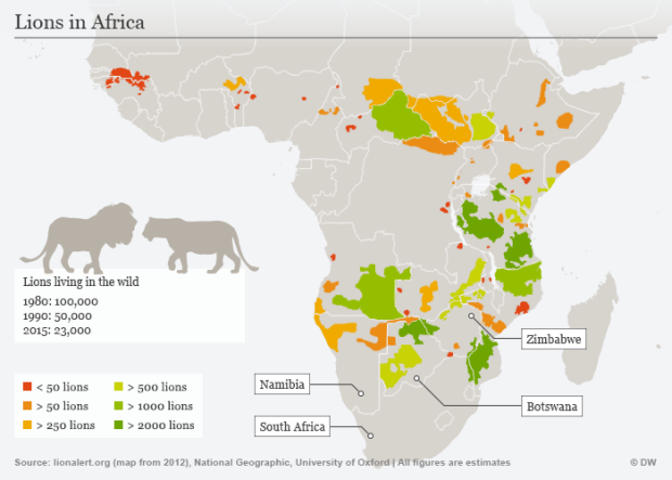Δραματική περιγράφεται η κατάσταση κυρίως στη Δυτική, Ανατολική και Κεντρική Αφρική. Τα τελευταία 35 χρόνια ο αριθμός των λιονταριών έχει μειωθεί στο μισό και προβλέπεται πως και μέσα στα επόμενα 20 χρόνια θα μειωθούν και πάλι κατά το ήμισυ.