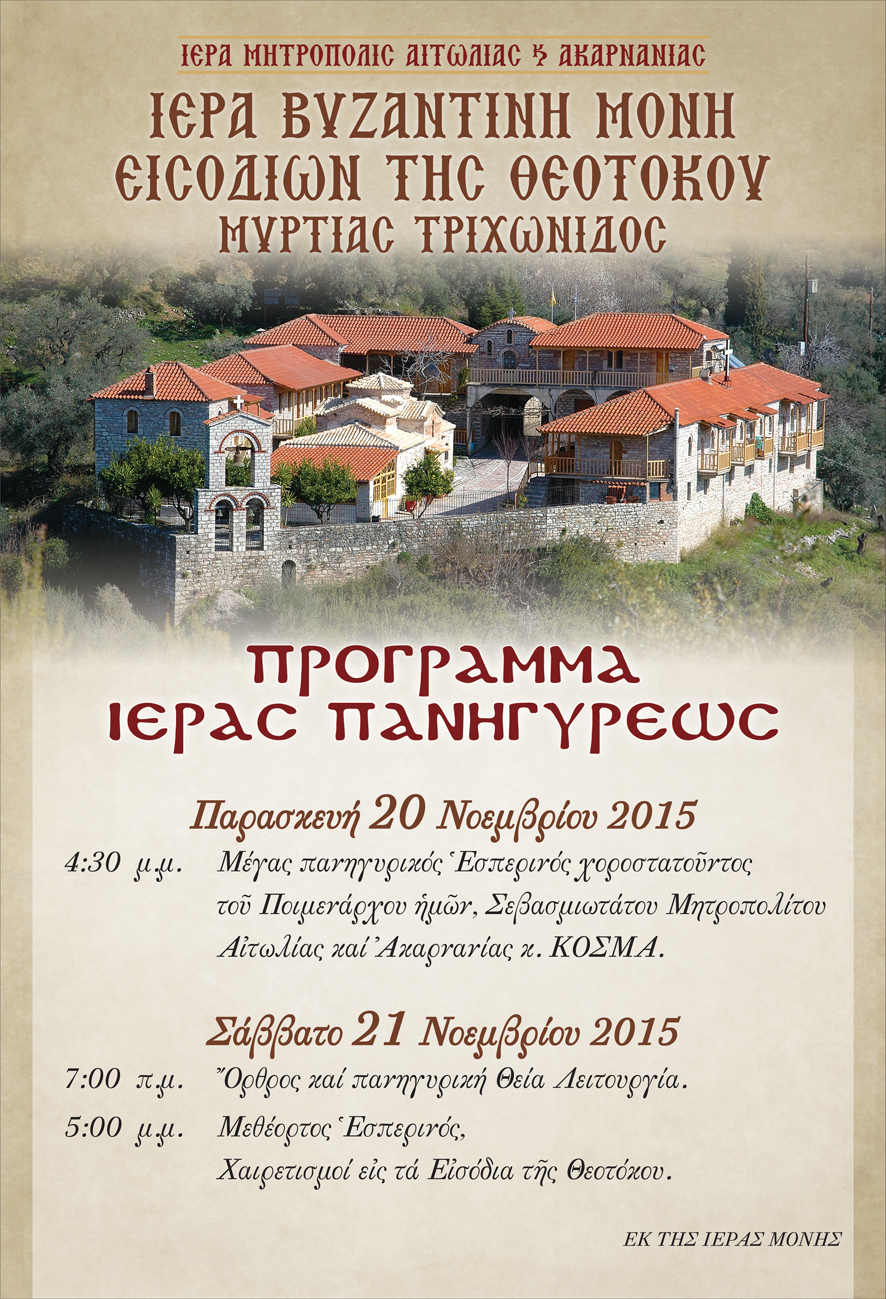 Το ερχόμενο Σάββατο 21 Νοεμβρίου 2015 πανηγυρίζει η Ιερά Βυζαντινή Μονή Μυρτιάς Τριχωνίδος την μεγάλη θεομητορική εορτή των Εισοδίων της Υπεραγίας Θεοτόκου.