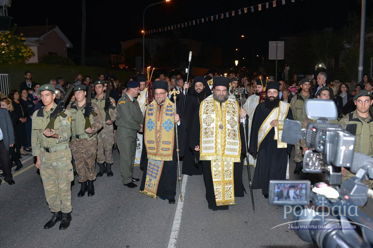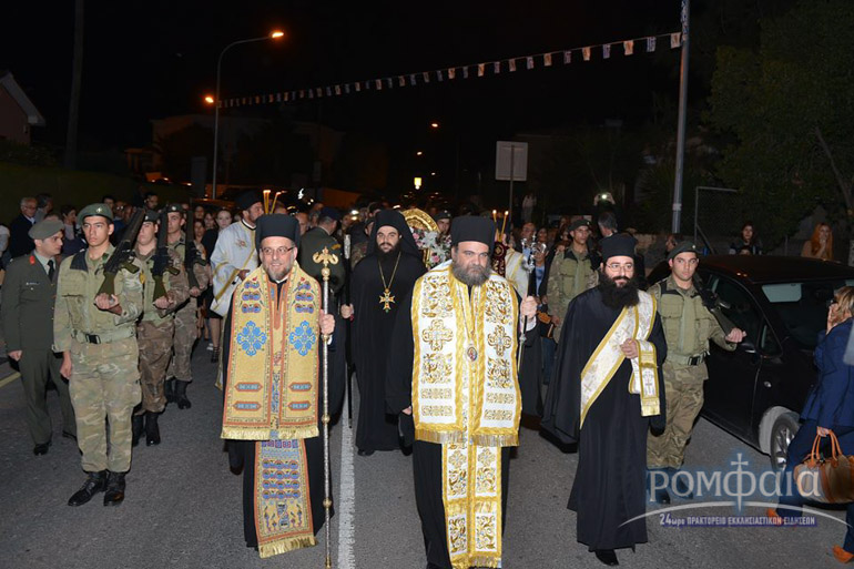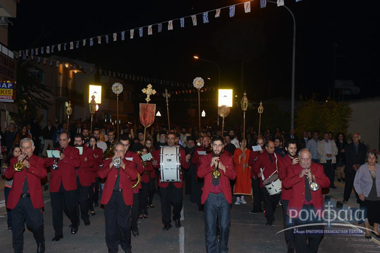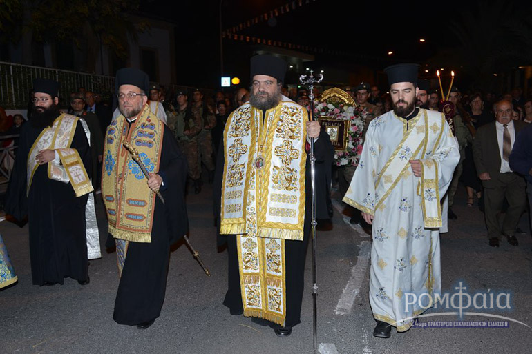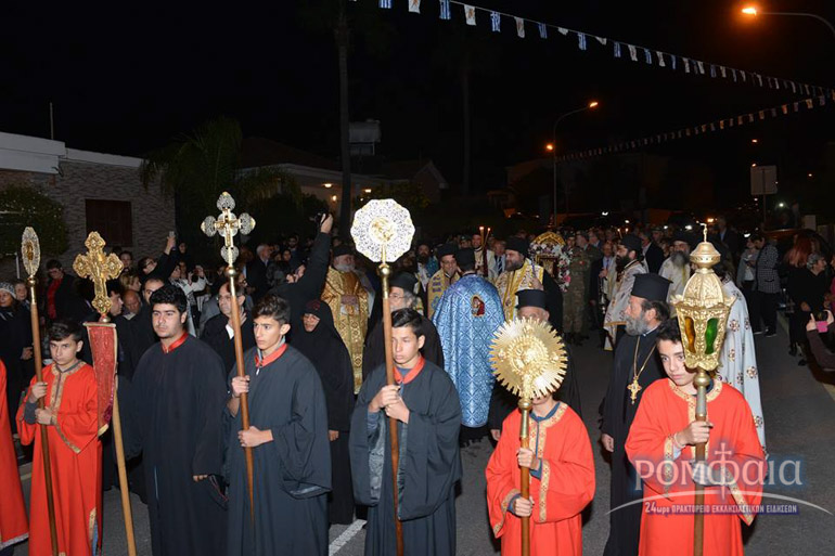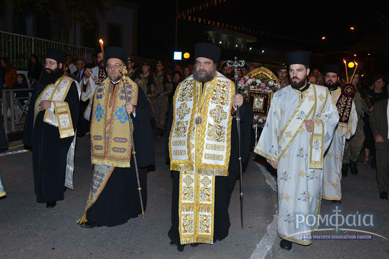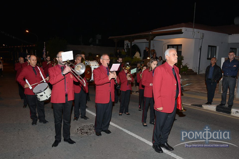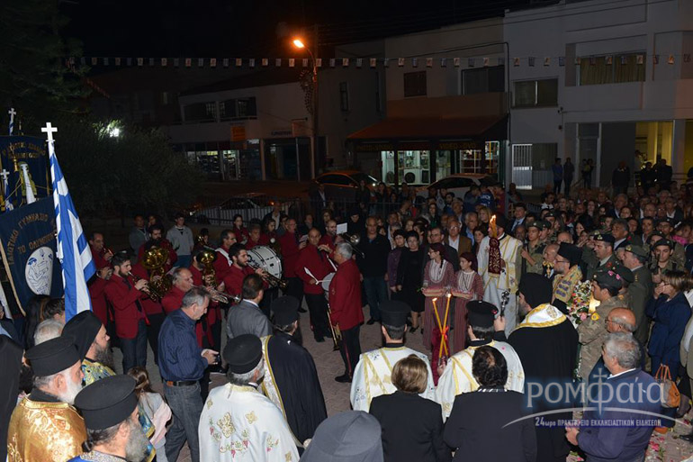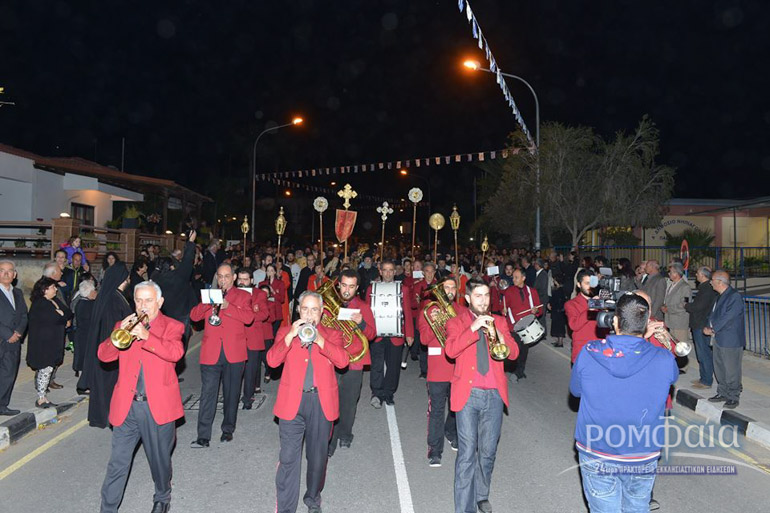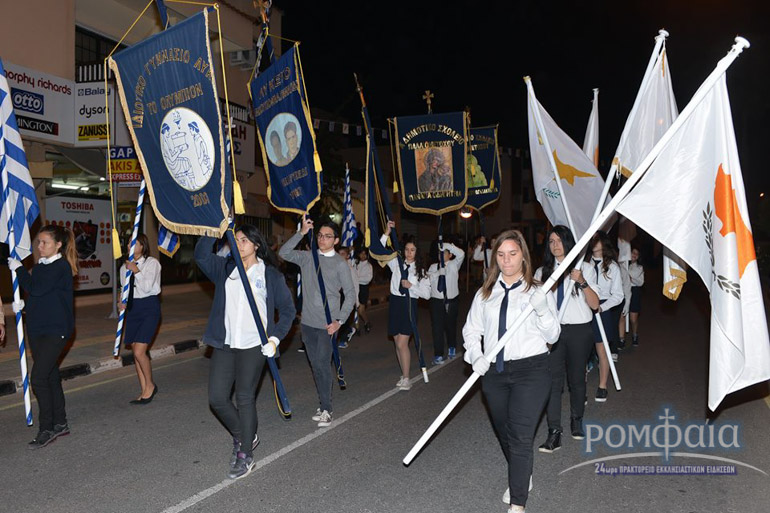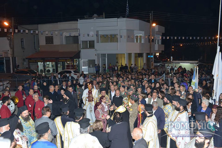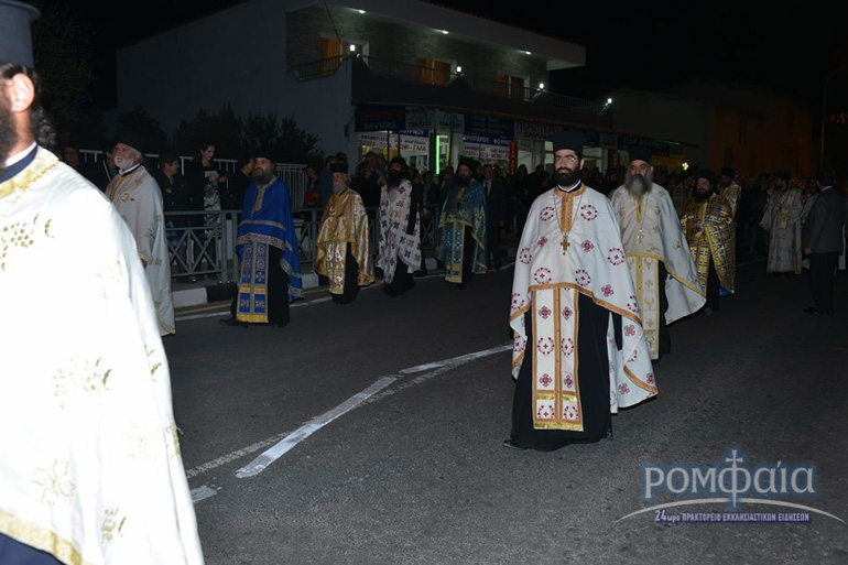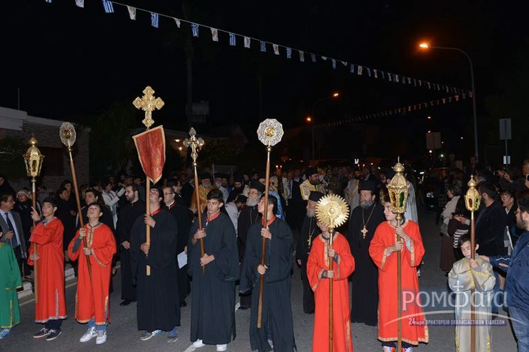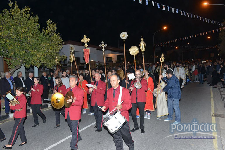 Αφού προηγήθηκε πομπή προς τον ιερό Ναό παιανίζοντας εμβατήρια η φιλαρμονική της Ιεράς Μητροπόλεως και συνοδεία πλήθος κόσμου ακολούθησε δέηση και εσπερινός χοροστατούντος του Σεβασμιωτάτου Μητροπολίτου Ρόδου κ. Κυρίλλου και συνχοροστατούντος του Πανιερωτάτου Μητροπολίτου Ταμασού και Ορεινής.
