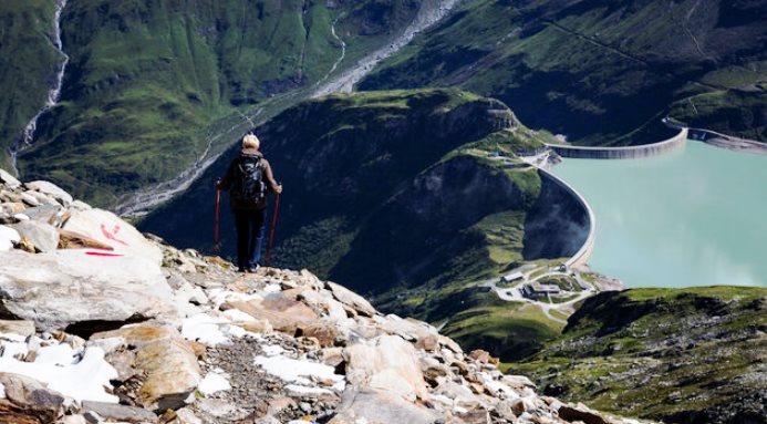 MOOSERBODEN, AUSTRIA – AUGUST 22: Young woman hiking on a trail down to the mountain reservoir Mooserboden on August 22, 2014, in Mooserboden, Austria. (Photo by Thomas Trutschel/Photothek via Getty Images)***Local Caption***