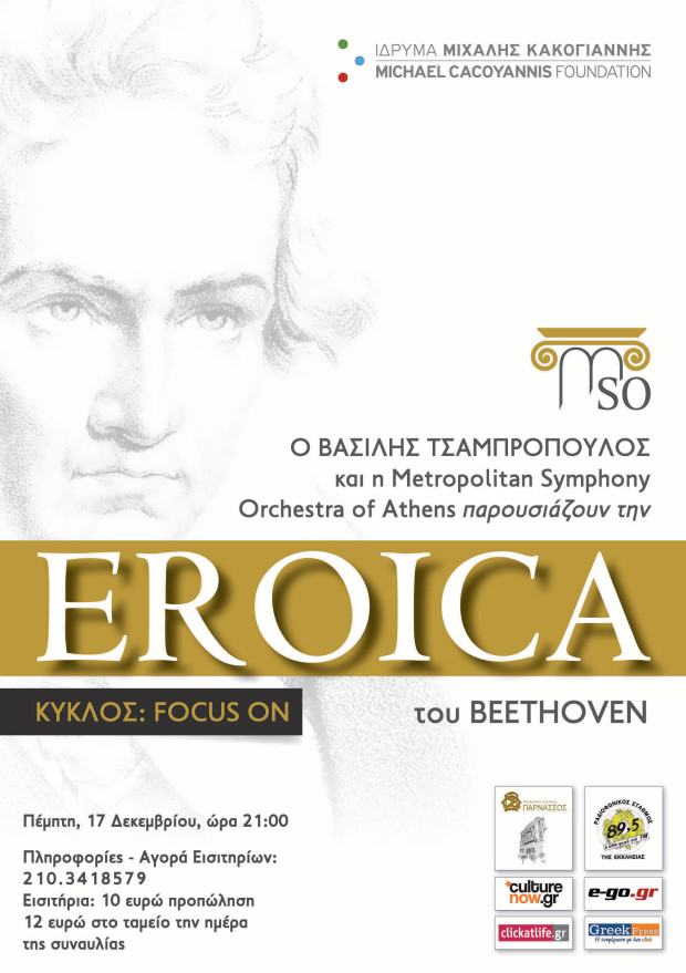 Στις 17 Δεκεμβρίου, ημέρα της γέννησης και της βάπτισης του Μπετόβεν, η Μητροπολιτική Συμφωνική Ορχήστρα Αθηνων παρουσίασει την EROICA, την περίφημη Ηρωική Συμφωνία του Μπετόβεν, στο πλαίσιο του κύκλου «Focus on». Στο πρώτο μέρος ο Βασίλης Τσαμπρόπουλος, με μέσο τον λόγο και το πιάνο του, θα αναλύσει άγνωστες πτυχές του έργου με έναν εξαιρετικά πρωτότυπο τρόπο, όπως δεν έχει παρουσιαστεί ποτέ ξανά σε συναυλίες κλασικής μουσικής. Αυτή είναι και η πρωτοτυπία του κύκλου «Focus On»! Στο δεύτερο μέρος η MSO of Athens θα ερμηνεύσει την Ηρωική Συμφωνία.