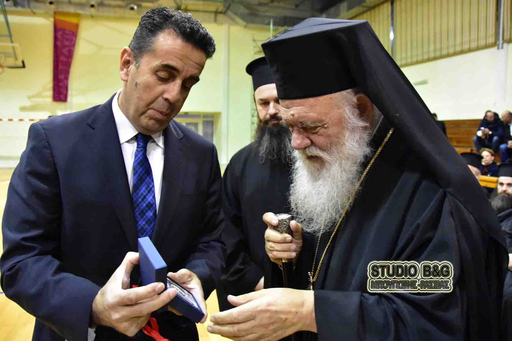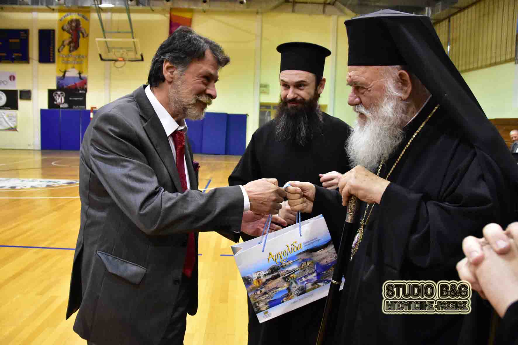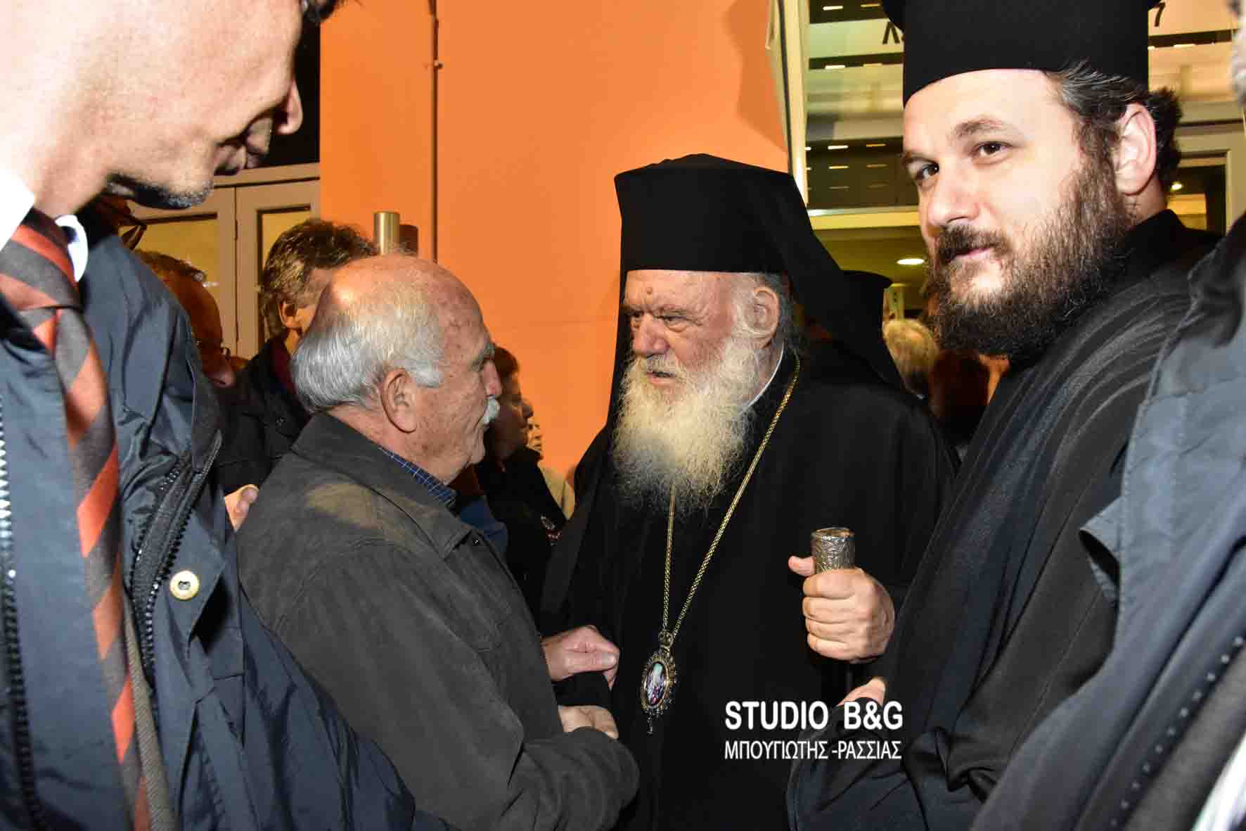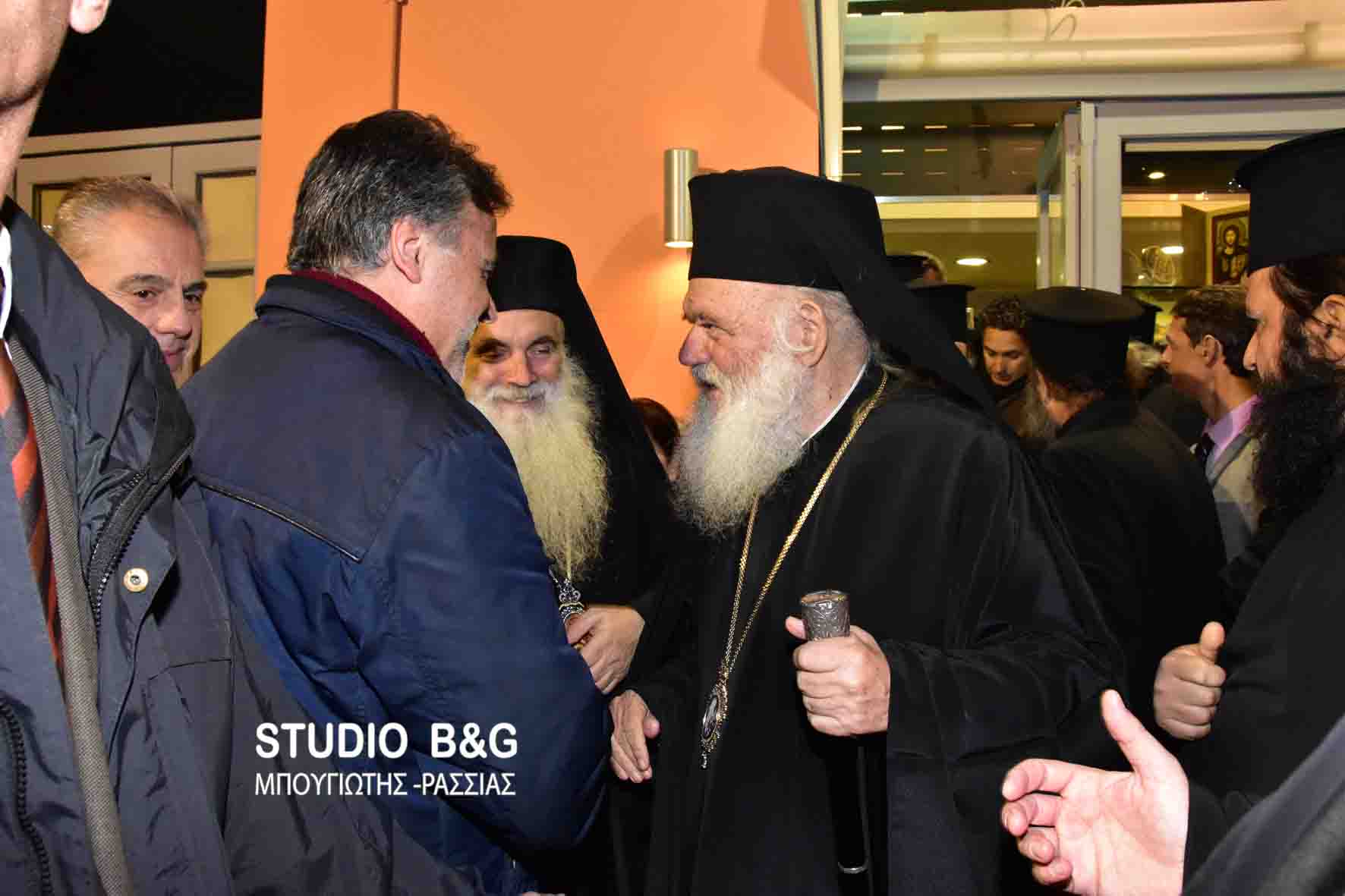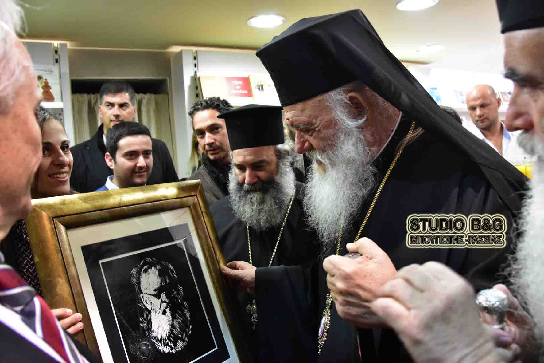 Ο Αρχιεπίσκοπος μετά την συνάντηση με τα παιδιά στο κλειστό γυμναστήριο της πόλης , τέλεσε την ακολουθία του Αγιασμού στο νέο εκκλησιαστικό βιβλιοπωλείο της Μητροπόλεως Αργολίδος ,στο Ναύπλιο. Ο μητροπολίτης Αργολίδος Νεκτάριος ευχαρίστησε τον Αρχιεπίσκοπο για την τιμή που έκανε και επισκέφτηκε για τρίτη φορά σε ένα χρόνο την Αργολίδα και του δώρισε ένα πίνακα με το αυθεντικό ποτρέτο του Αρχιεπισκόπου Συμφερουπόλεως και Κριμαίας Λουκά του ιατρού. Τον Αρχιεπίσκοπο υποδέχθηκαν μεταξύ άλλων οι Βουλευτές Αργολίδος Ι.Ανδριανός και Ι. Μανιάτης , ο αντιπεριφερειάρχης Αργολίδος Α.Χειβιδόπουλος, ο θεματικός αντιπεριφερειάρχης Πελοποννήσου Β.Σιδέρης, οι δήμαρχοι Ναυπλίου Δ .Κωστούρος και Άργους Δ .Καμπόσος , η πρώην βουλευτής Ε. Παπαδημητρίου, και πάρα πολύς κόσμος.