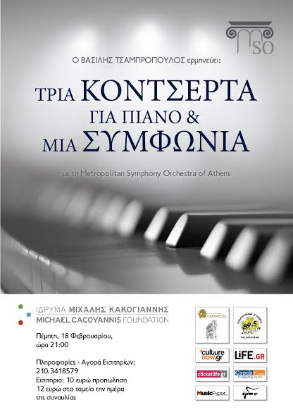 Ο Βασίλης Τσαμπρόπουλος και η Μητροπολιτική Συμφωνική Ορχήστρα Αθηνών παρουσιάζουν την Πέμπτη, 18 Φεβρουαρίου, στο Ίδρυμα Μιχάλης Κακογιάννης, ώρα 21:00, μία ιδιαίτερη συναυλία, όπου θα ερμηνευθούν τρία κοντσέρτα για πιάνο των: J. S. Bach, J. Haydn, W. A. Mozart, από τον διεθνούς φήμης δεξιοτέχνη πιανίστα, συνθέτη και μαέστρο, και μία από τις πιο γνωστές Συμφωνίες του W. A. Mozart, την οποία συνέθεσε στα 17 του χρόνια.
