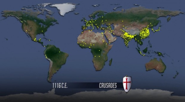 Στο 3:30, στις αρχές του 14ου αιώνα η Μαύρη Πανώλη εξαπλώνεται στην Ευρώπη εξοντώνοντας το ένα τρίτο του πληθυσμού της Γηραιάς Ηπείρου, περίπου 20 εκατομμύρια ανθρώπους. Η επιδημία ξαναχτύπησε και στα επόμενα χρόνια του 14ου αιώνα, με μικρά χρονικά διαλείμματα, αναιρώντας έτσι ολοκληρωτικά τη δημογραφική αύξηση που είχε σημειωθεί στα μέσα του 13ου αιώνα.