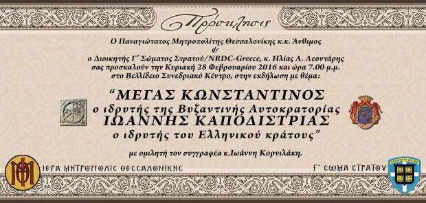 Μία ιστορική διάλεξη για τον Μέγα Κωνσταντίνο το θεμελιωτή της Βυζαντινής Αυτοκρατορίας και τον Ιωάννη Καποδίστρια, τον θεμελιωτή του Ελληνικού Κράτους, διοργανώνει η Ιερά Μητρόπολη Θεσσαλονίκης σε συνεργασία με το Γ’ Σώμα Στρατού, την ερχόμενη Κυριακή 28 Φεβρουαρίου και ώρα 7 μ.μ. στο Βελλίδειο Συνεδριακό Κέντρο της συμπρωτεύουσας.
