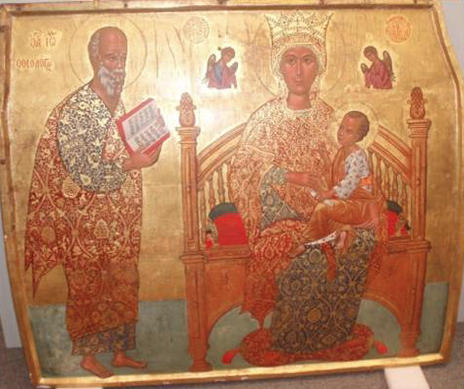 Η εικόνα της Παναγίας έχει διατάσεις 114 χ 134 εκατ. Η Παναγία είναι μα παραλλαγή του τύπου της Οδηγήτριας. Ένθρονη σε μετωπική στάση, βλέπει μπροστά και κρατά με το αριστερό της χέρι τον Χριστό. Φέρει το δεξί της χέρι χαμηλά μπροστά στο στήθος, κοντά στον Χριστό.