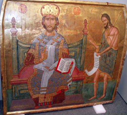 Στην πρώτη εικόνα διατάσεων 110 χ 128 εκατ. εικονίζεται ο Χριστός «ό Βασιλεύς των Βασιλευόντων καί Μύγας Άρχιερεύς», ένθρονος, καθώς και ο Ιωάννης ο Πρόδρομος στραμμένος προς τον Χριστό. Ο Χριστός είναι ντυμένος με αρχιερατικά άμφια και μίτρα. Με το δεξί υψωμένο χέρι ευλογεί ενώ με το αριστερό στηρίζει ανοικτό ευαγγέλιο. Ο Ιωάννης ο Πρόδρομος στραμμένος προς τον Χριστό, έχει υψωμένο το δεξί του χέρι και δείχνει προς τον θεάνθρωπο, ενώ με το αριστερό χέρι κρατεί ράβδο και ανοικτό ειλητάριο. Στο κάτω μέρος της εικόνας, κάτω από τα πόδια του Προδόμου, υπάρχει η υπογραφή του ζωγράφου και η χρονολογία με κόκκινα κεφαλαία γράμματα: «ΧΕΙΡ ΜΕΛΕΤΙΟΥ ΤΟΥ ΚΡΙΤΟΣ ΑΧΚ(=1620) Χ(ριστό) Υ». «Μ(ηνός) Αυγούστου).