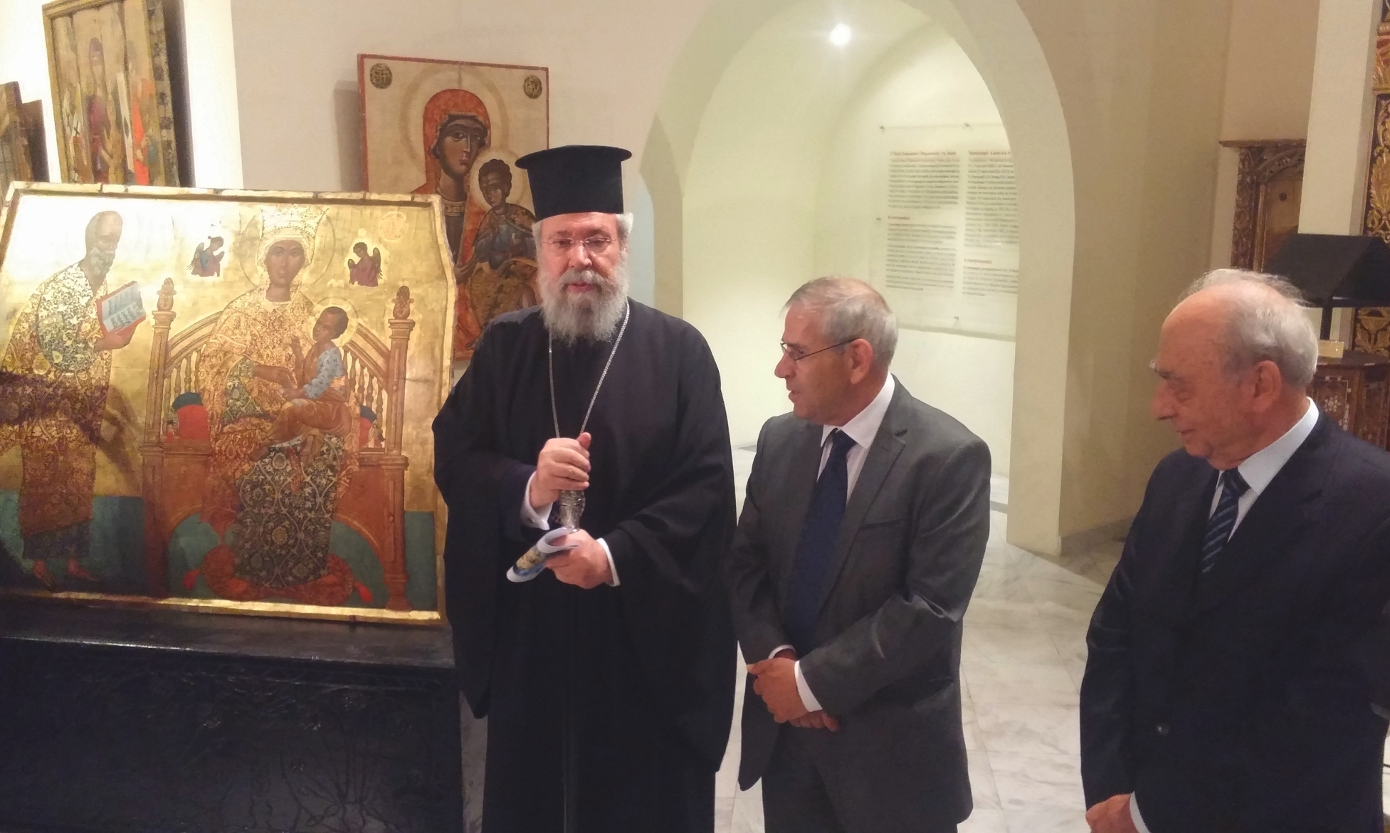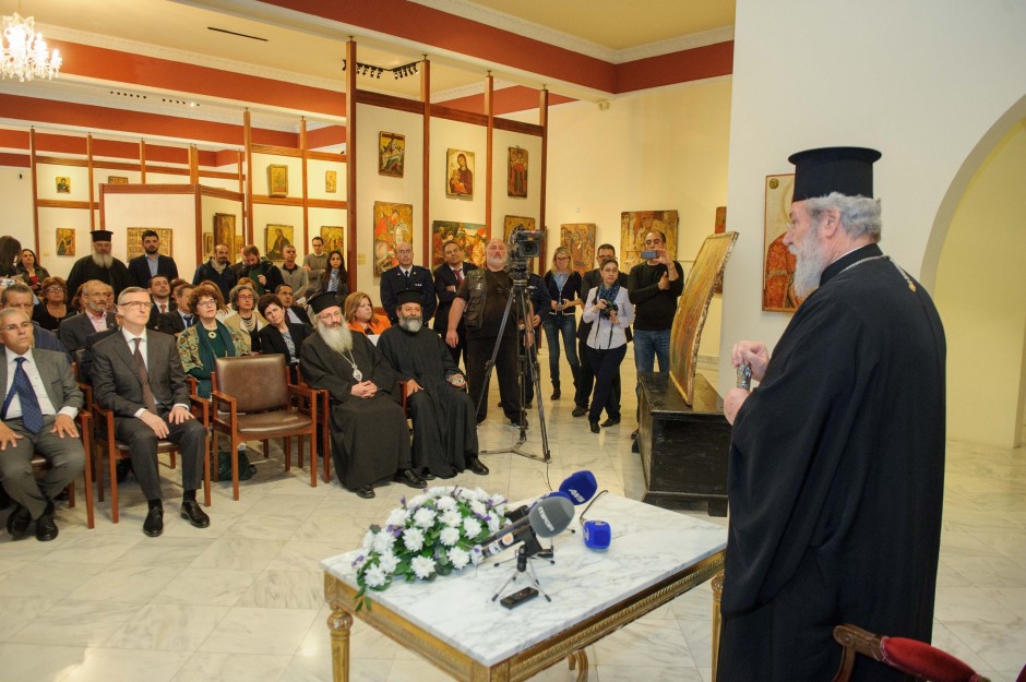 Ο Μακαριώτατος Αρχιεπίσκοπος Κύπρου κ. Χρυσόστομος, στο δικό του χαιρετισμό δήλωσε ότι «σήμερα υποδεχθήκαμε ακόμα δύο θησαυρούς της πατρίδας μας και εύχομαι να συνεχιστεί αυτή η επιτυχία, γιατί είναι χιλιάδες οι εικόνες και τα αντικείμενα, αρχαιολογικοί θησαυροί της Κύπρου που βρίσκονται στην ξένη και πρέπει να έρθουν στο δικό τους το χώρο». «Να ευχαριστήσω όλους εκείνους που συνέβαλαν, ούτως ώστε οι δύο εικόνες να βρίσκονται σήμερα κοντά μας. Το Υπουργείο Μεταφορών, το Τμήμα Αρχαιοτήτων, την Γενική Εισαγγελία, την Αστυνομία, τον Πρόξενο της Κύπρου στην Ζυρύχη», πρόσθεσε.