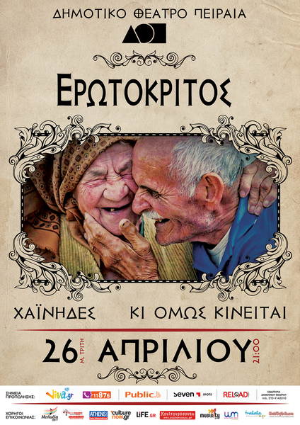 Οι «Χαΐνηδες» ανεβάζουν «Ερωτόκριτο». Για την ακρίβεια προτείνουν μια διαφορετική ανάγνωση του σημαντικού έργου, της «τραγουδοαφήγησης που πότισε, με απόλυτο τρόπο, τη μουσική παράδοση, έπλασε σε μεγάλο βαθμό τη γλώσσα που μιλιέται σε αυτόν τον τόπο, συγκίνησε γενιές ανθρώπων, τους δάνεισε εικόνες και σύμβολα για τον έρωτα, τον ηρωισμό, τη φιλία, τη γενναιότητα, την αξιοπρέπεια, τον πόνο, το σωστό, το λάθος και τελικά υιοθετήθηκε απόλυτα ως σύμβολο-αντιπρόσωπος του πολιτισμού τους». Στη νέα εκδοχή του «η διαλεκτική της τραγουδαφήγησης από τα πολλά διαφορετικά όργανα και τις φωνές, συμπληρώνεται και διαχέεται στη θεατρική πτυχή του έργου, από τη στικτική ή αντιστικτική παρουσία της ομάδας “κι όμΩς κινείται”». Μουσική «Χαΐνηδες», χορογραφία «κι όμΩς κινείται».