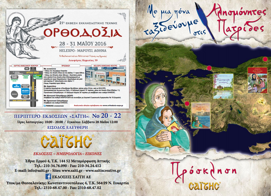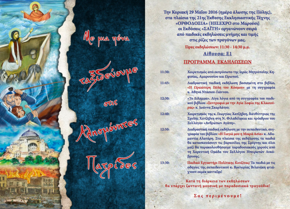 Πρόσκληση για το καινούριο βιβλίο <<Η γιαγιά μου… η ΜΙΚΡΑ ΑΣΙΑ>> που θα παρουσιαστεί στα πλαίσια των πολιτιστικών εκδηλώσεων  των εκδόσεων Σαίτη << Με μια πένα ταξιδεύοντας στις αλησμόνητες πατρίδες >>, στις 29 Μαιου 2016, στις 12:00 το μεσημέρι, στην Helexpo στο Μαρούσι, αίθουσα Ε1.