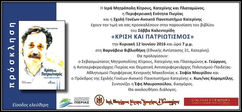 Παρουσίαση του νέου βιβλίου «Κρίση και πατριωτισμός» του Σάββα Καλεντερίδη την 12η Ιουνίου στίς 19:00 στην Βαρνάβειο βιβλιοθήκη Κατερίνης 3 Ιουνίου 2016 Tags:Παρουσίαση του νέου βιβλίου «Κρίση και πατριωτισμός» του Σάββα Καλεντερίδη την 12η Ιουνίου στίς 19:00 στην Βαρνάβειο βιβλιοθήκη Κατερίνης