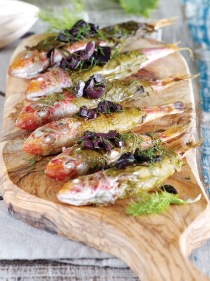 Ψητά μπαρμπούνια σε αμπελόφυλλα με σάλτσα μάραθου