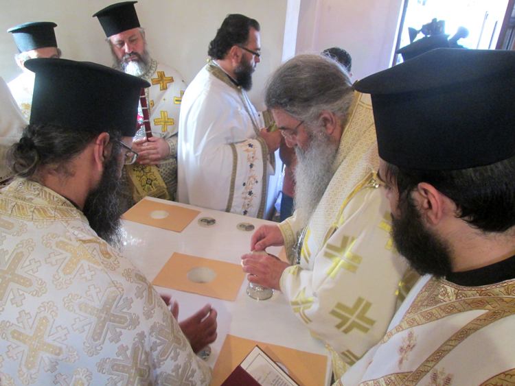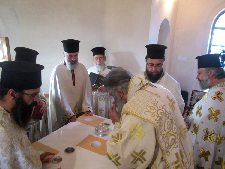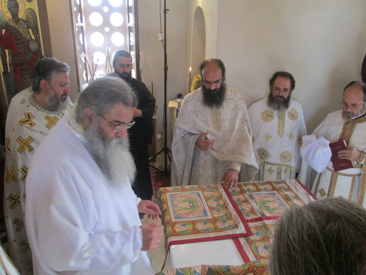 »Στο άκουσμα του αιτήματος αυτού κι όταν ο ναός άδειασε, εισήλθαμε στο Ιερό μαζί με τον πατέρα Στυλιανό, κι αρχίσαμε να ψάχνουμε την αγία Τράπεζα για να διαπιστώσουμε αν όντως είχαν γίνει εγκαίνια. Ο εγκαινιασμός ενός ναού φαίνεται αν στο κέντρο της αγίας Τράπεζας, στην οπή, που ονομάζεται «φυτόν», έχουν τοποθετηθεί μέσα λείψανα αγίων μαρτύρων και έχουν σφραγιστεί με κηρομάστιχο, κι αν οι τέσσερις γωνίες είναι κλειστές πάλι με κηρομάστιχο, αφού προηγουμένως έχουν τοποθετηθεί σε κάθε γωνία η εικόνα ενός από τους τέσσερεις Ευαγγελιστές.