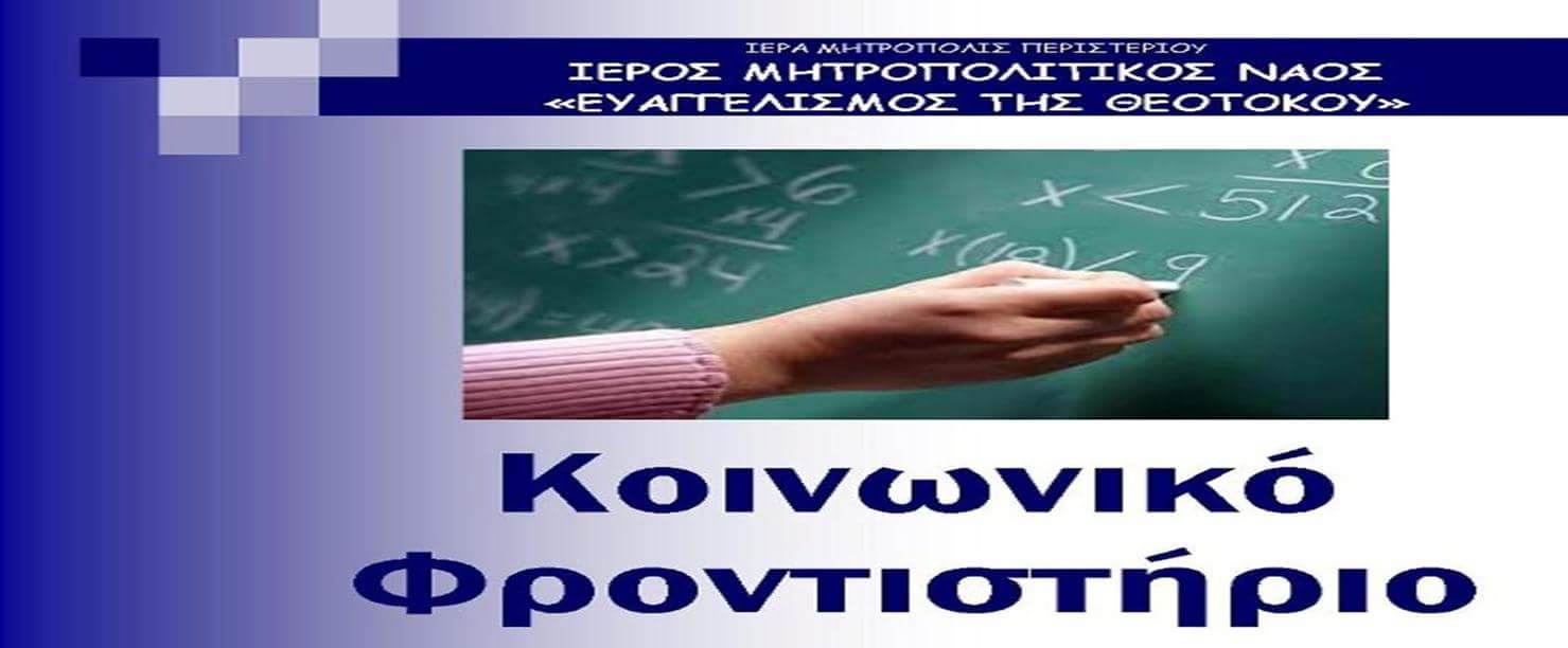 Το ΚΟΙΝΩΝΙΚΟ ΦΡΟΝΤΙΣΤΗΡΙΟ ΤΟΥ ΜΗΤΡΟΠΟΛΙΤΙΚΟΥ ΙΕΡΟΥ ΝΑΟΥ «ΕΥΑΓΓΕΛΙΣΤΡΙΑΣ» ΠΕΡΙΣΤΕΡΙΟΥ λειτουργεί για ακόμη μια σχολική χρονιά με πλήρες διδακτικό πρόγραμμα και με εθελοντές καθηγητές όλων των ειδικοτήτων που απαιτούνται για τα μαθήματα των τριών τάξεων του Λυκείου υπο την ευθύνη του σεβασμιωτάτου Μητροπολίτου Περιστερίου Κ.Κ. ΧΡΥΣΟΣΤΟΜΟΥ. Πέρυσι το εν λόγω Κοινωνικό Φροντιστήριο είχε 81% επιτυχία στις πανελλαδικές εξετάσεις.