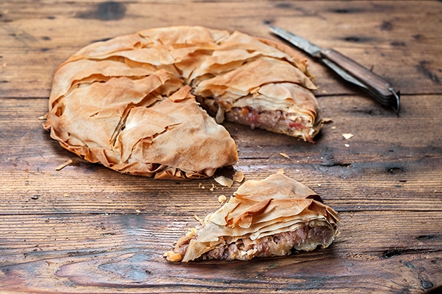 Χαράζουμε την πίτα, ραντίζουμε την επιφάνεια με λίγο ελαιόλαδο και λίγο νερό πεταχτά με τα δάχτυλα. Ψήνουμε για 1 ώρα περίπου στους 180ºC στις αντιστάσεις στην τελευταία σχάρα. Αφού βγάλουμε την πίτα την αφήνουμε να σταθεί για 15′ έπειτα κόβουμε σε κομμάτια.