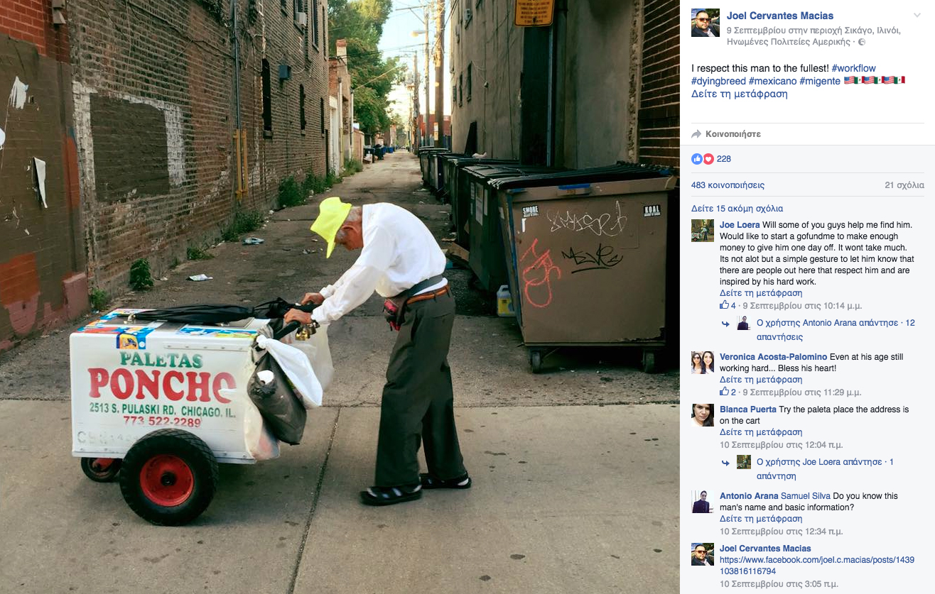 «Ράγισε η καρδιά μου όταν είδα αυτό τον άνδρα που κανονικά θα έπρεπε να απολαμβάνει τα οφέλη της συνταξιοδότησης» έγραψε ο Joel Cervantes Macias, ο άνθρωπος που ξεκίνησε τον διαδικτυακό έρανο.