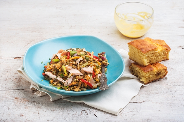 Χωρίζουμε σε φλέικς τη σάρκα του σολομού και την προσθέτουμε στη ζέστη σαλάτα φακής. Ανακατεύουμε και σερβίρουμε ζέστη ή σε θερμοκρασία δωματίου.