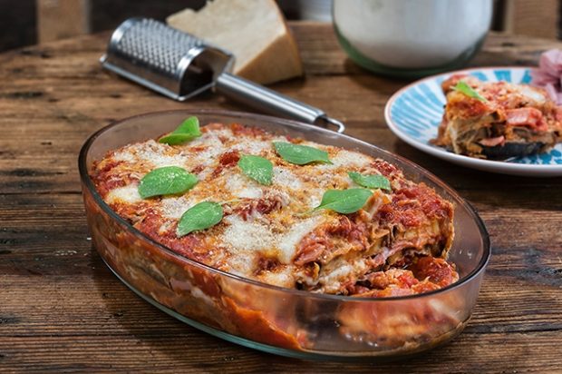 Μελιτζάνες φούρνου με σάλτσα ντομάτας, ζαμπόν και τυριά