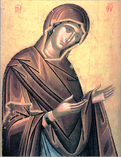 «Ἡ Παναγία εἰκονίζεται σὲ προτομή, δεομένη, σὲ στροφὴ τριῶν τετάρτων πρὸς τὰ δεξιά. Φοράει γαλαζωπὸ χιτώνα καὶ κεραμίδι μαφόριο μὲ χρυσὴ παρυφὴ καὶ κρόσσια. Τρία χρυσὰ ἀστεροειδὴ κοσμήματα πάνω στὸ μαφόριο ἀποτελοῦν σύμβολα τῆς Ἁγίας Τριάδος καὶ ὑπαινίσσονται τὸν ῥόλο τῆς Παναγίας στὴν ἐνσάρκωση.