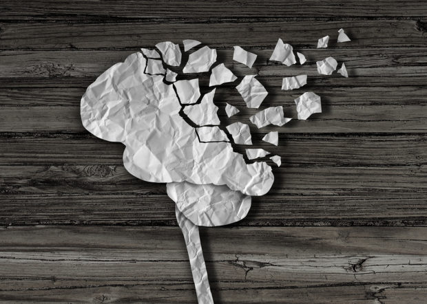 Dementia or brain damage and injury as a mental health and neurology medical symbol with a thinking human organ made of crumpled paper torn in pieces as a creative concept for alzheimer disease.