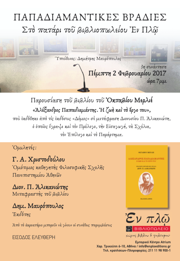 Παρουσίαση του βιβλίου: Αλέξανδρος Παπαδιαμάντης, η ζωή και το έργο του, του Οκτάβιου Μερλιέ στο βιβλιοπωλείο Εν ΠΛΩ