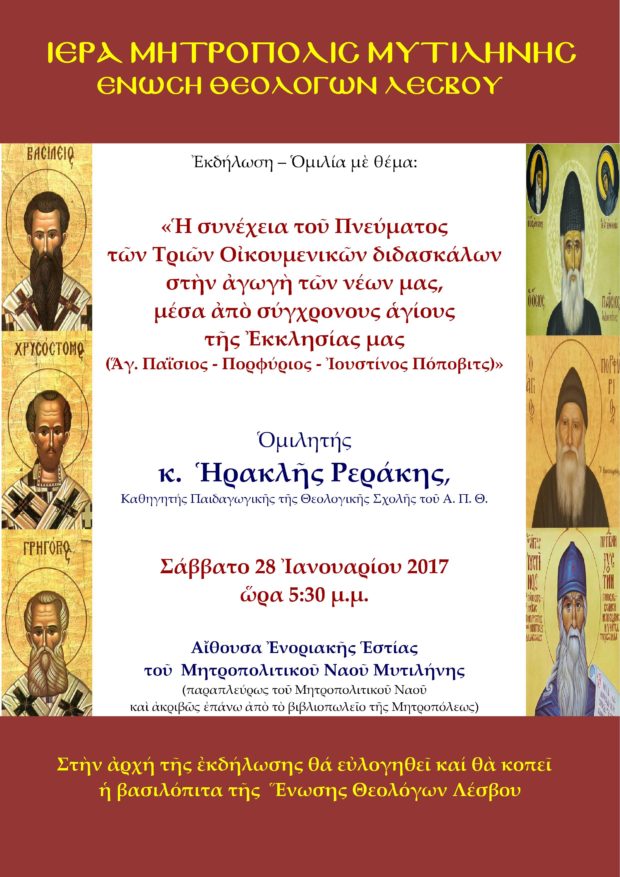 Η Ιερά Μητρόπολις Μυτιλήνης και η Ένωση Θεολόγων Λέσβου διοργανώνουν εκδήλωση – ομιλία, το Σάββατο 28 Ιανουαρίου 2017 και ώρα 5:30 μ.μ., στην αίθουσα τήςΕνοριακής Εστίας του Μητροπολιτικού Ναού Μυτιλήνης(παραπλεύρως του Μητροπολιτικού Ναού και ακριβώς επάνωαπό το βιβλιοπωλείο της Μητροπόλεως), με θέμα: