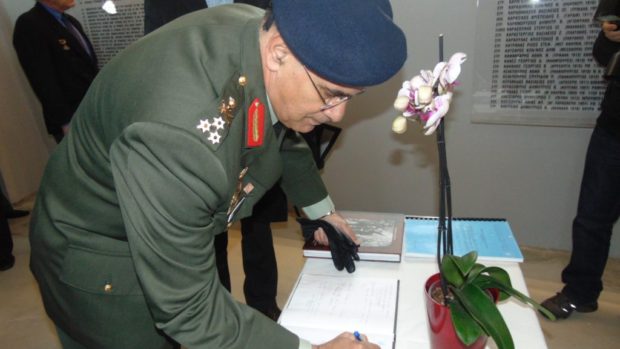 Ο Στρατάρχης περιηγήθηκε στο Εσωτερικό του Μνημείου όπου είναι εγγεγραμμένα των ονόματα των Πεσόντων Μαχητών και υπέγραψε στο βιβλίο των επισκεπτών του Μνημείου …