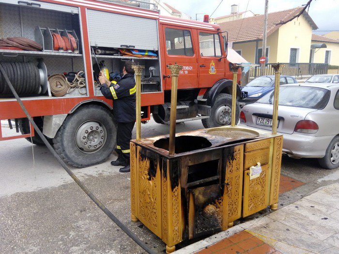 Αμέσως ο π. Νικόλαος, χωρίς δεύτερη σκέψη, έτρεξε και σε πρώτη φάση προσπάθησε να σβήσει τη φωτιά, που προκλήθηκε πιθανότατα από τα κεριά στο μανουάλι, με τον πυροσβεστήρα του αυτοκινήτου του διοικητή του ΑΤ Ληξουρίου.