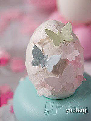 Αφού βάψετε τα αυγά σας σε παλ ροζ χρώμα, θα κολλήσετε πάνω τους με ισχυρή κόλλα πεταλούδες και λουλουδάκια, τα οποία θα έχετε κόψει με τη βοήθεια περφορατέρ σε τέτοια σχέδια, από λεπτό χαρτί για χειροτεχνίες. Δεν θα θέλετε να τα τσουγκρίσετε!