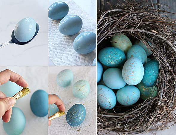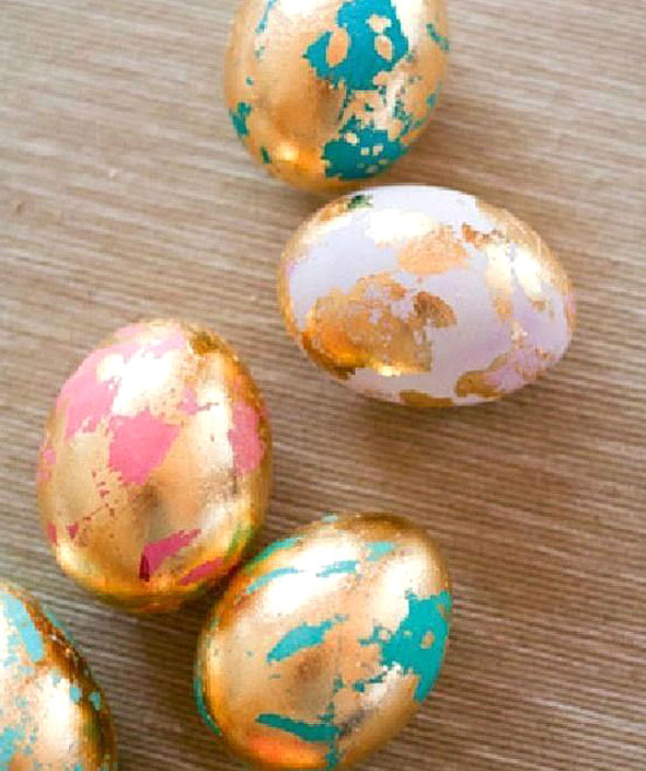 Βάψτε τα αυγά σας σε παστέλ αποχρώσεις, αφήστε τα να κρυώσουν και στη συνέχεια καλύψτε τα με ιμιτασιόν φύλλα χρυσού που θα βρείτε εύκολα στο εμπόριο, σε καταστήματα με είδη για χειροτεχνίες. Δείτε ενδεικτικά εδώ.